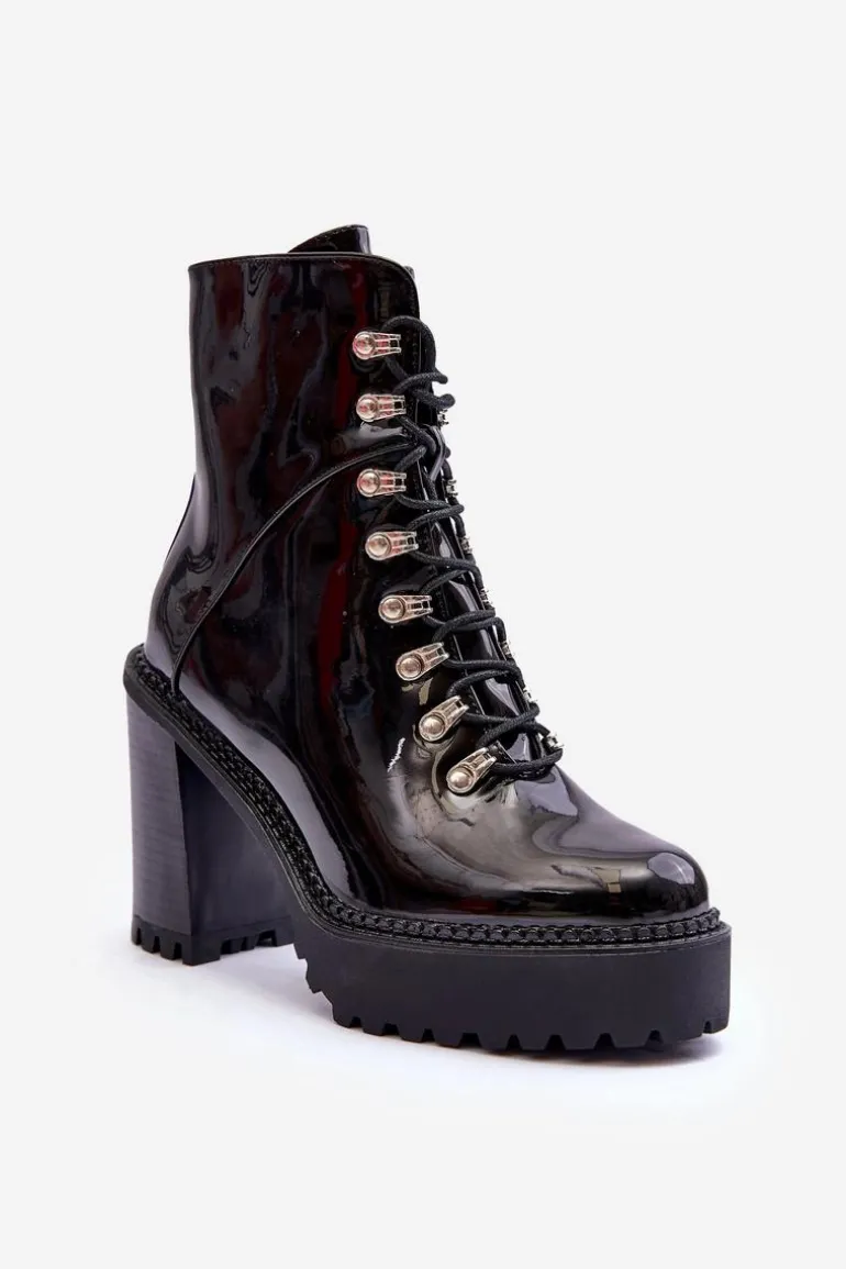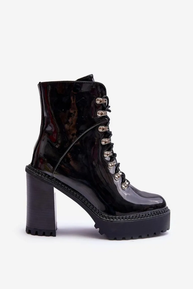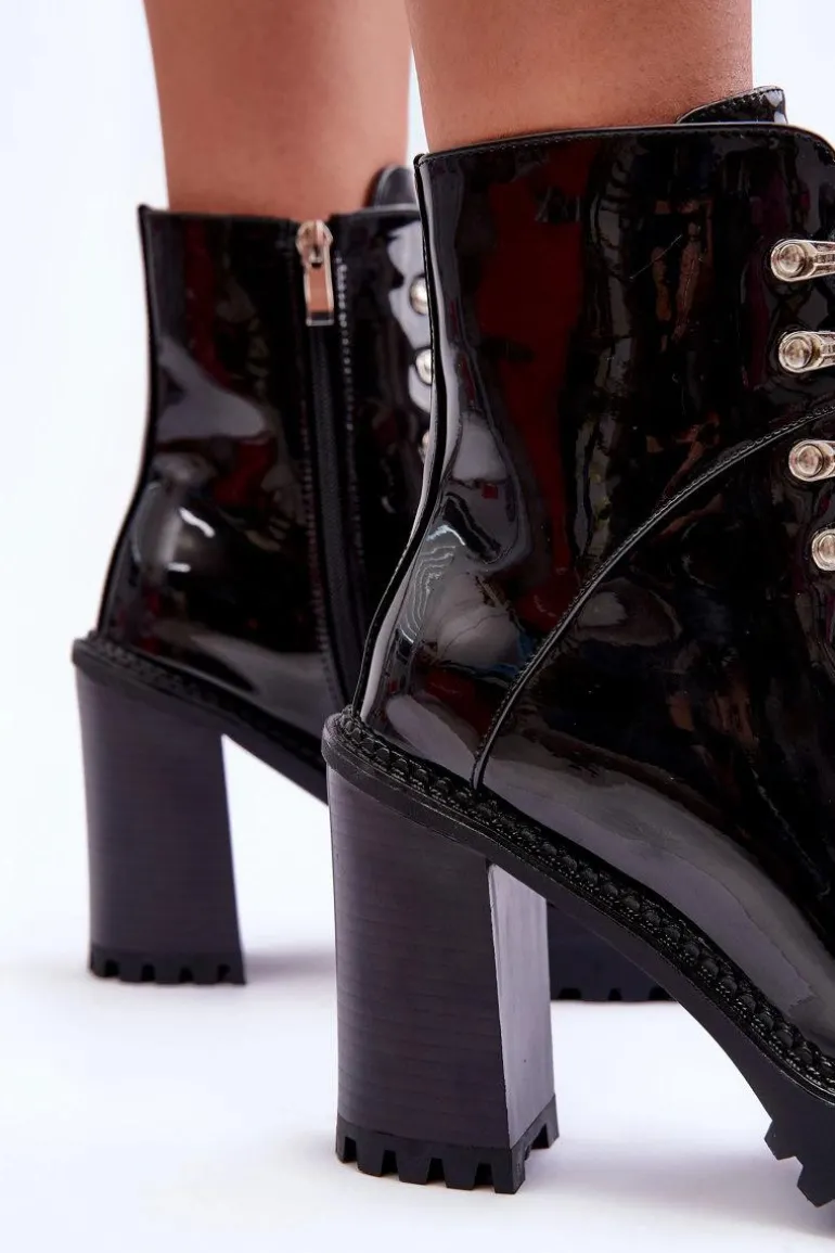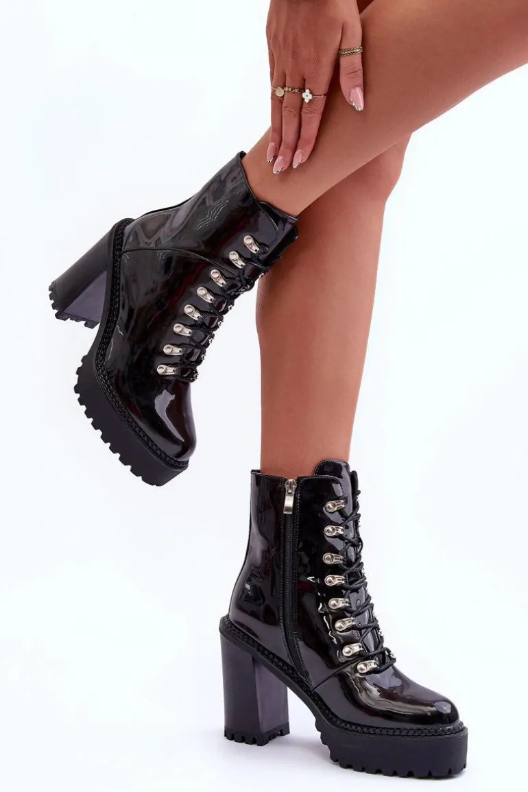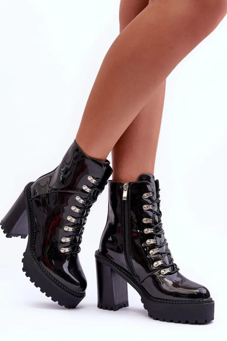 Masywne botki zostały wykonane z eko skóry. Osadzone na platformie oraz wysokim obcasie w postaci stabilnego słupka. Zapinane na suwak po wewnętrznej stronie cholewki oraz dodatkowo sznurowane. Materiałowa wkładka zapewni komfortowe użytkowanie obuwia. Koniecznie musisz je mieć! Przy wyborze rozmiaru prosimy sugerować się tabelą rozmiarów.