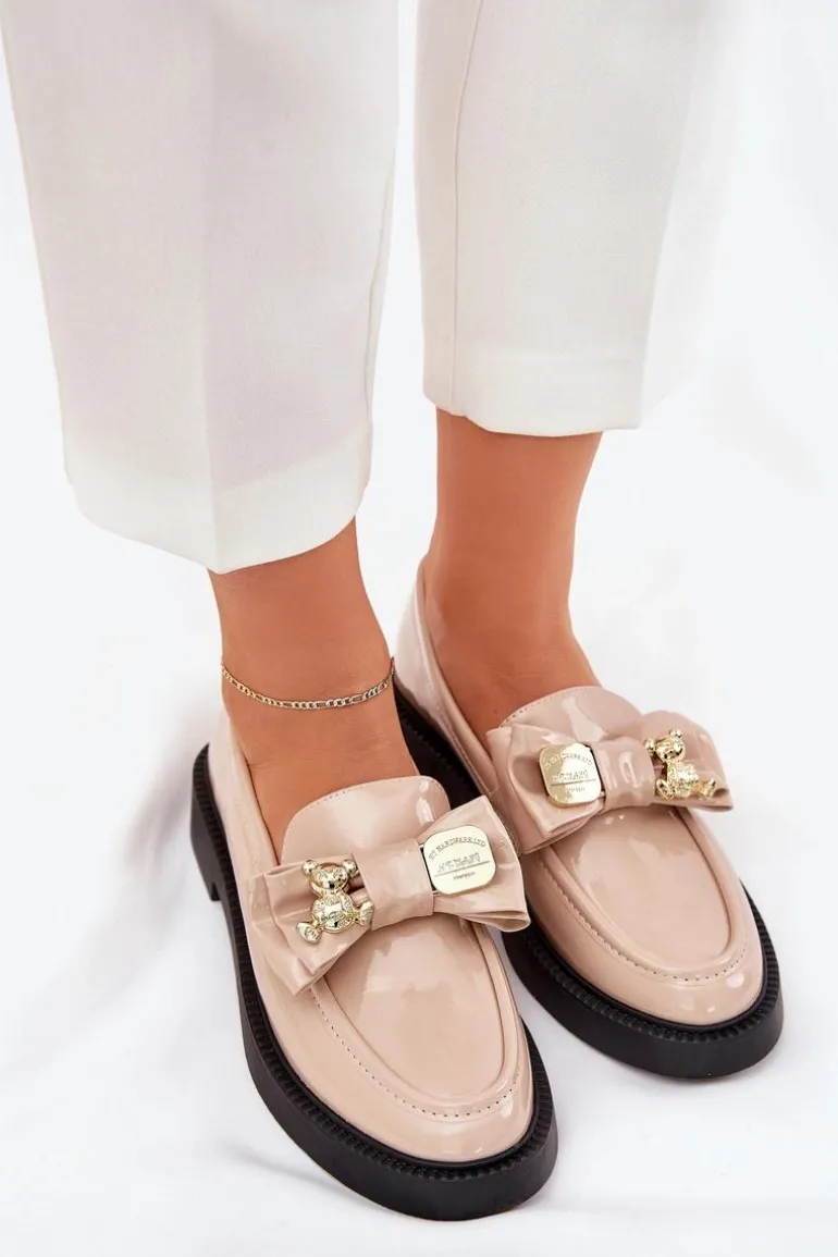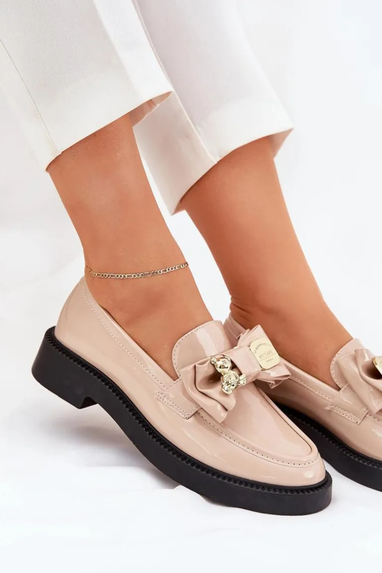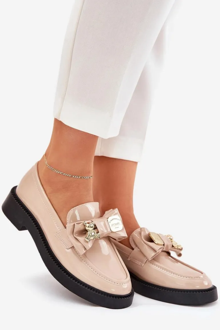 Modne mokasyny z eko skóry, które łączą elegancję z urokiem detali. Model posiada kokardkę z ozdobną broszką, która zdobi buty napisem i misiem, nadając im wyjątkowego charakteru. Zaokrąglone noski zapewniają komfort przez cały dzień, a klasyczny fason sprawia, że te mokasyny będą doskonałym wyborem do wielu stylizacji. Idealne na co dzień, łączą wygodę z modnym wyglądem. Przy wyborze rozmiaru prosimy sugerować się tabelą rozmiarów.