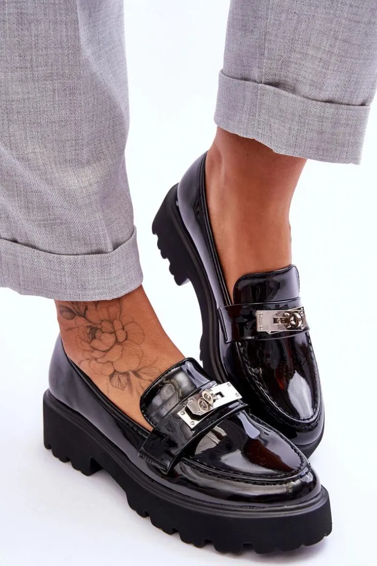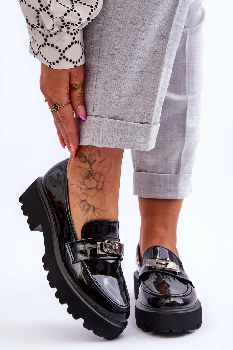 Mokasyny damskie zostały wykonane z eko skóry. Osadzono je na platformie i płaskim obcasie ze żłobieniami. Podeszwa została wykonana z tworzywa sztucznego. Miękka wkładka z eko skóry zapewni komfortowe użytkowanie. Mokasyny posiadają z przodu ozdobny element. Świetny model do wielu eleganckich i casualowych stylizacji. Przy wyborze rozmiaru prosimy sugerować się tabelą rozmiarów.
