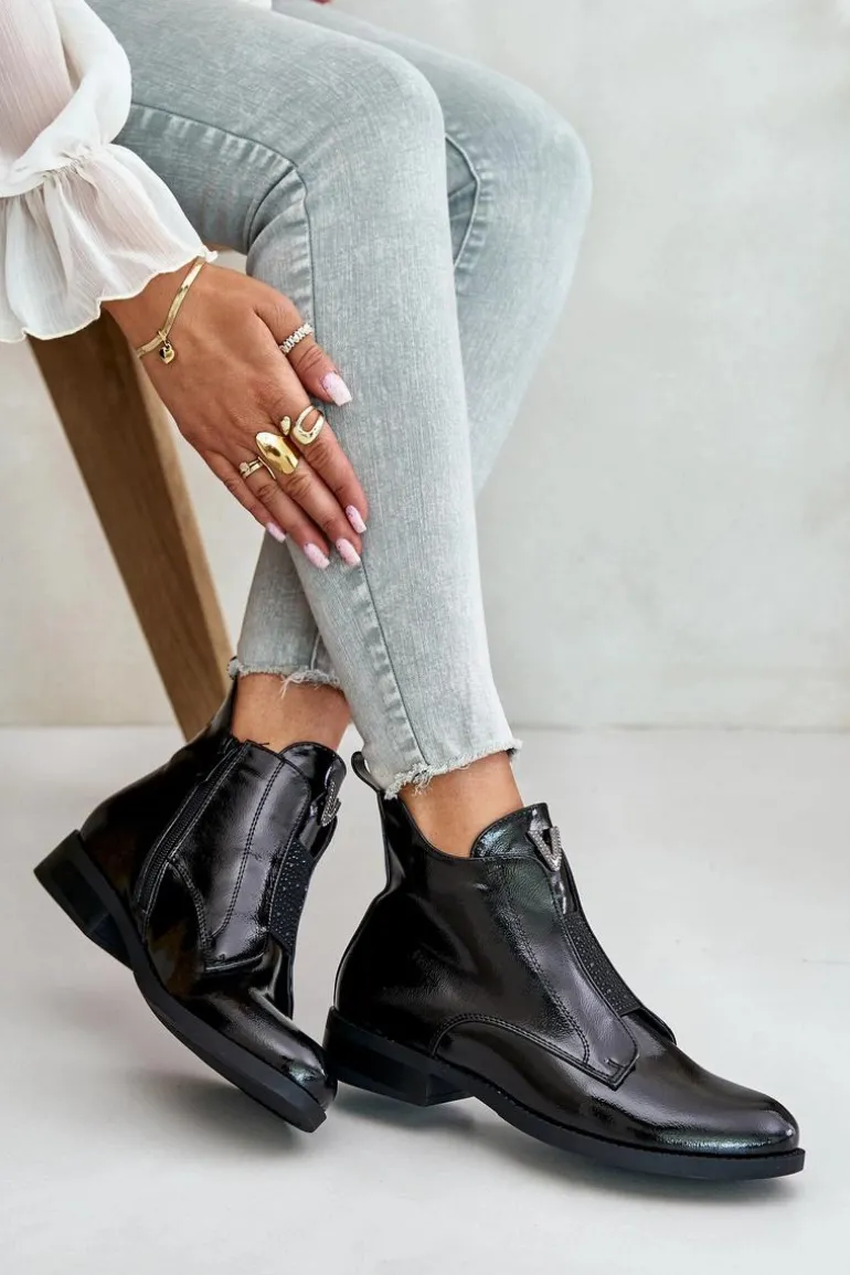 Botki damskie wykonane ze skóry ekologicznej. Osadzone na płaskim obcasie, który zapewni stabilność na każdym kroku. Środek ocieplony kocem obuwniczym. Noski zaokrąglone. Zapinane na zamek. Z przodu zdobiona, elastyczna wstawka oraz mały detal na języku. Cholewka za kostkę. Usztywniony zapiętek. Przy wyborze rozmiaru prosimy sugerować się tabelą rozmiarów.