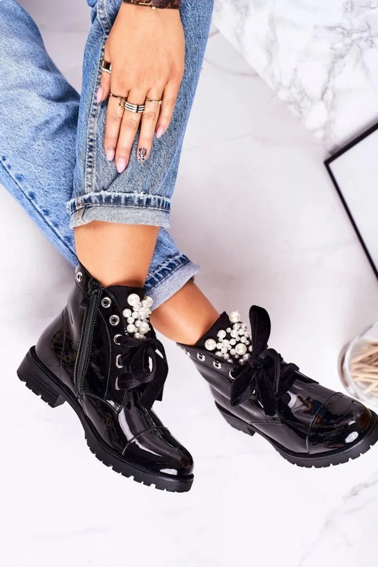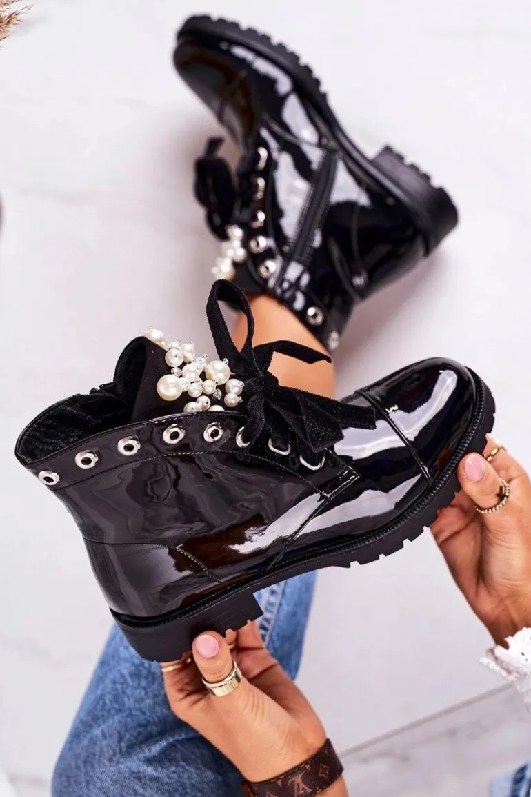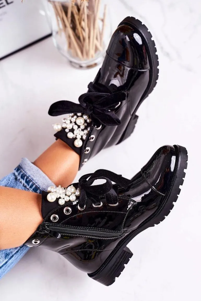 Lakierowane Ocieplane Botki Z Perełkami I Wstążką Czarne Perla
