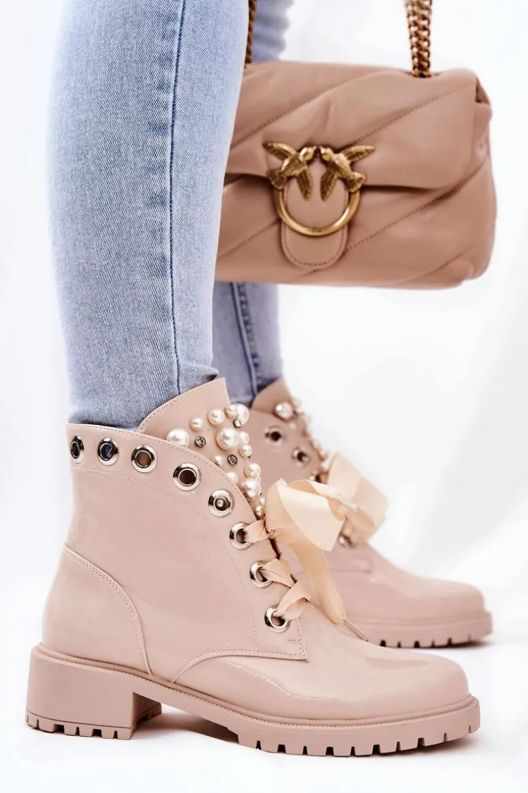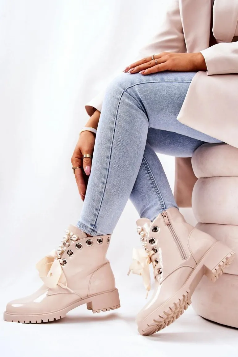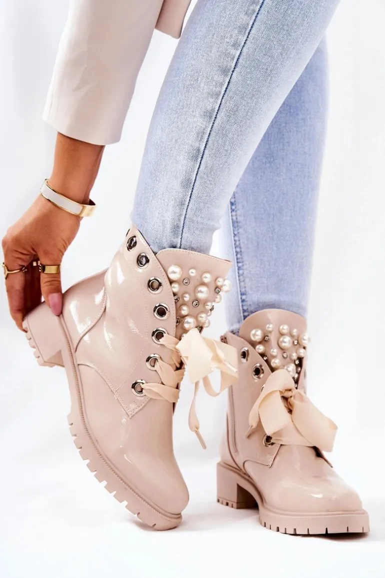 Wyjątkowe botki damskie wykonane z eko skóry. Wnętrze ocieplone jest miłym w dotyku kocem obuwniczym. Model wyróżnia się krojem cholewki oraz elementami w postaci perełek. Ozdobna wstążka świetnie dopełnia całość. Ten model musi być Twój! Nie czekaj dłużej aż zniknie! Przy wyborze rozmiaru prosimy sugerować się tabelą rozmiarów.