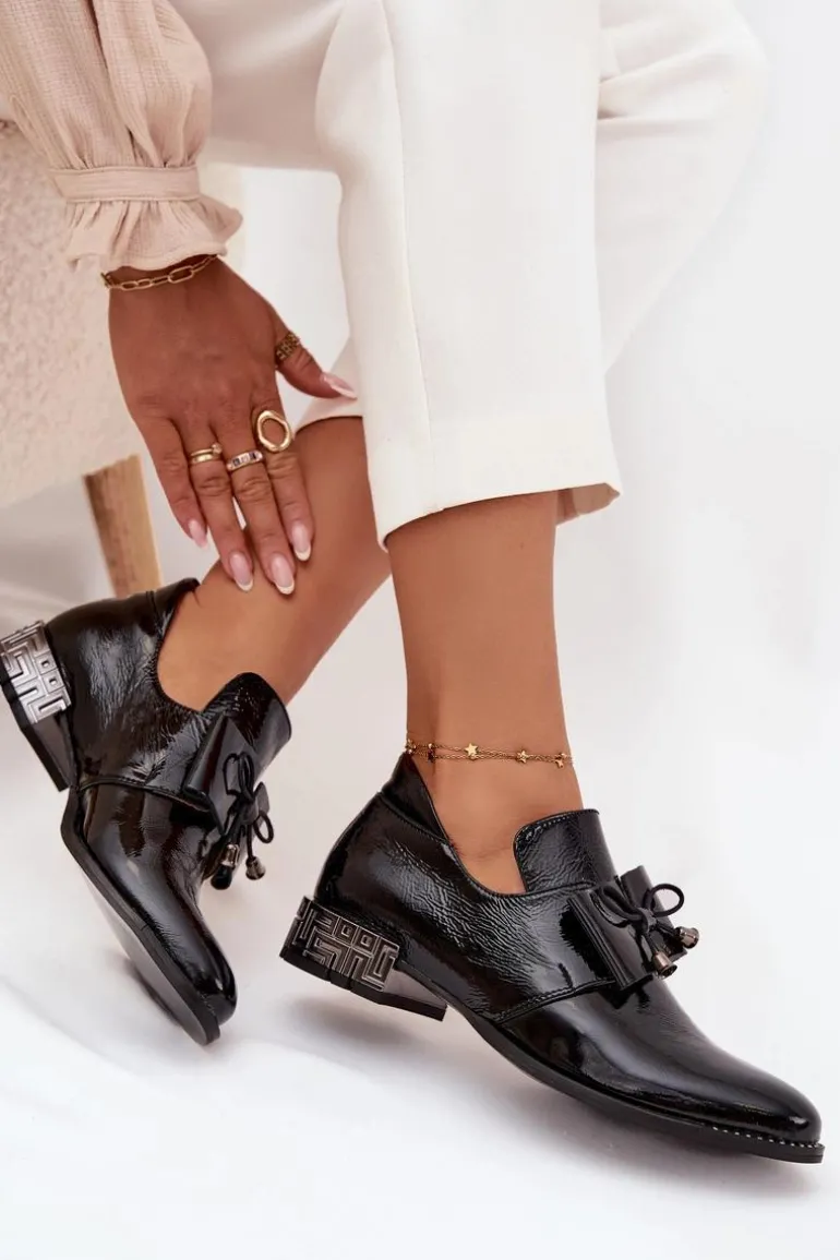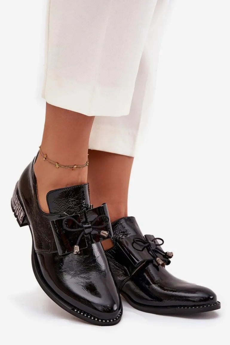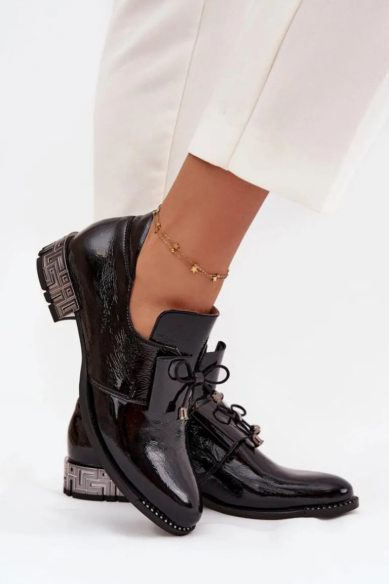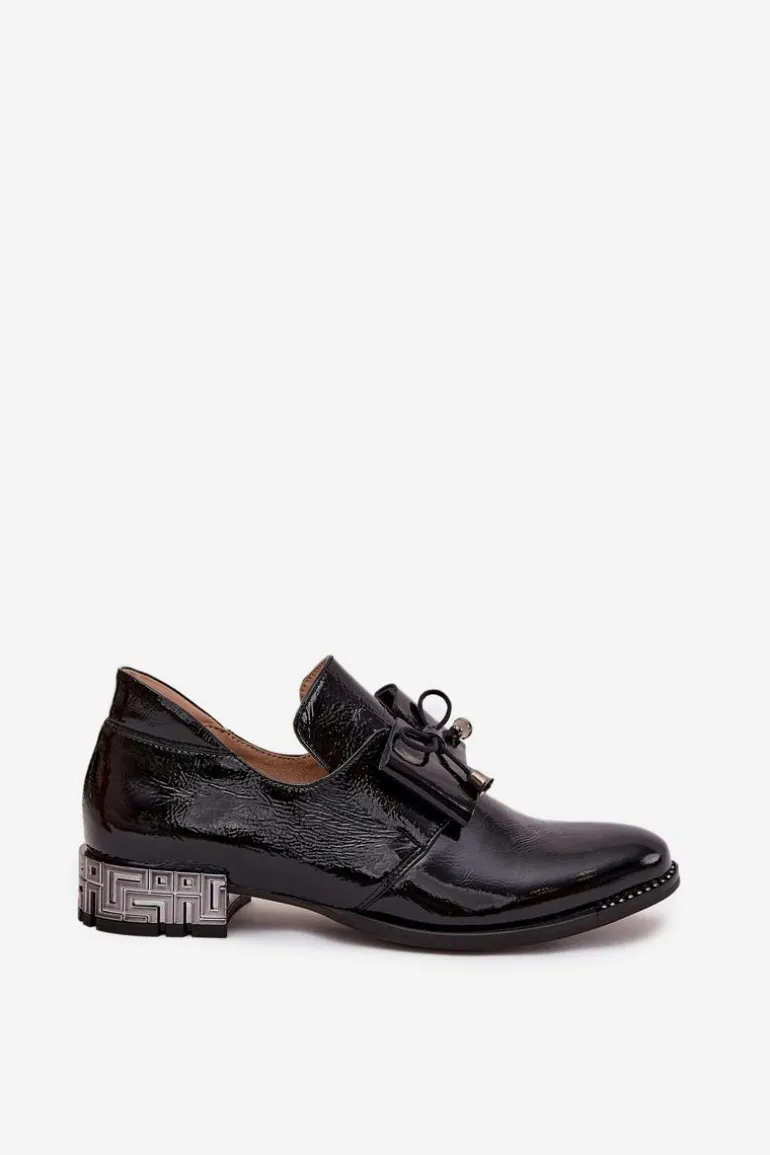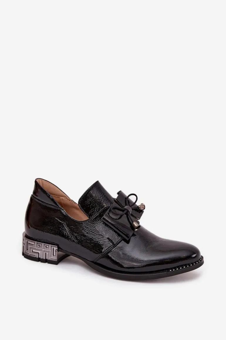 Półbuty damskie wykonane z naturalnej skóry to elegancka propozycja na co dzień i wyjątkowe okazje. Osadzone na niskim, ozdobnym obcasie zapewniają wygodę oraz subtelny, kobiecy wygląd. Klasyczny fason wsuwany ułatwia zakładanie, a uroku dodaje kokardka umieszczona z przodu buta. Dodatkowym akcentem są błyszczące cyrkonie zdobiące podeszwę przy nosku, które nadają całości szykownego, efektownego charakteru. To półbuty, które pięknie dopełnią zarówno casualowe stylizacje, jak i bardziej eleganckie zestawy.