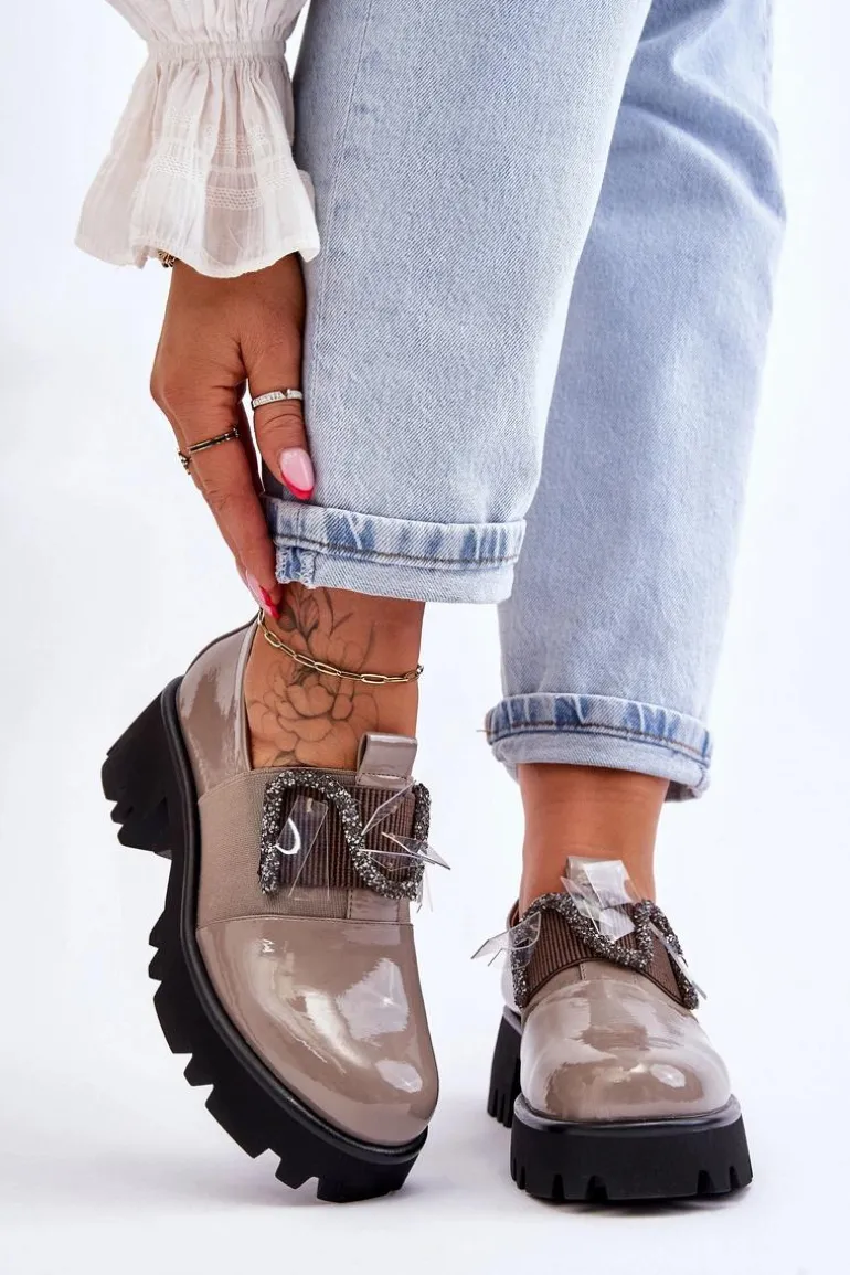 Niezwykłe półbuty damskie zostały osadzone na płaskim, masywnym obcasie oraz platformie. Wykonane z eko skóry z dbałością o szczegóły. Wkładka z naturalnej skóry zadba o Twój komfort podczas użytkowania. Idealnie będą pasować na wiele okazji. Model wsuwany, z ozdobami na przodzie. Koniecznie sprawdź całą naszą kolekcję półbutów! Przy wyborze rozmiaru prosimy sugerować się tabelą rozmiarów.
