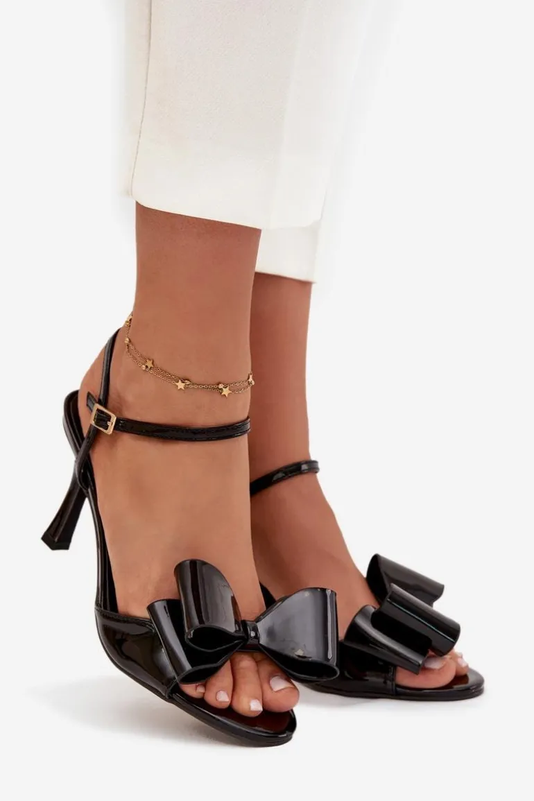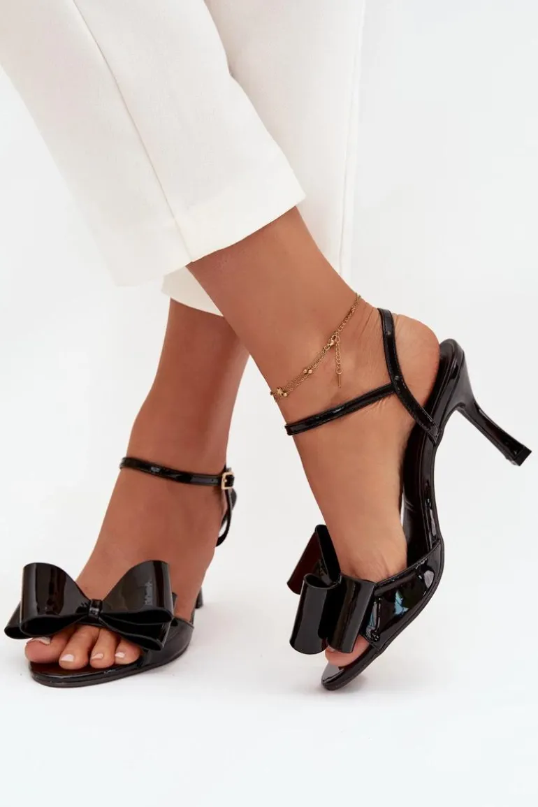 Sandały damskie wykonane z wysokiej jakości eko skóry to połączenie elegancji i kobiecego stylu. Osadzone na smukłej szpilce pięknie wydłużają sylwetkę i dodają lekkości każdej stylizacji. Regulowany pasek zapinany na sprzączkę umożliwia idealne dopasowanie do stopy. Uwagę przyciąga ozdobna kokarda umieszczona z przodu, która nadaje subtelnego, dziewczęcego uroku. To model, który doskonale sprawi się zarówno na wyjątkowe okazje, takie jak przyjęcia czy uroczystości, jak i do eleganckich, wieczorowych stylizacji. Przy wyborze rozmiaru prosimy sugerować się tabelą rozmiarów.