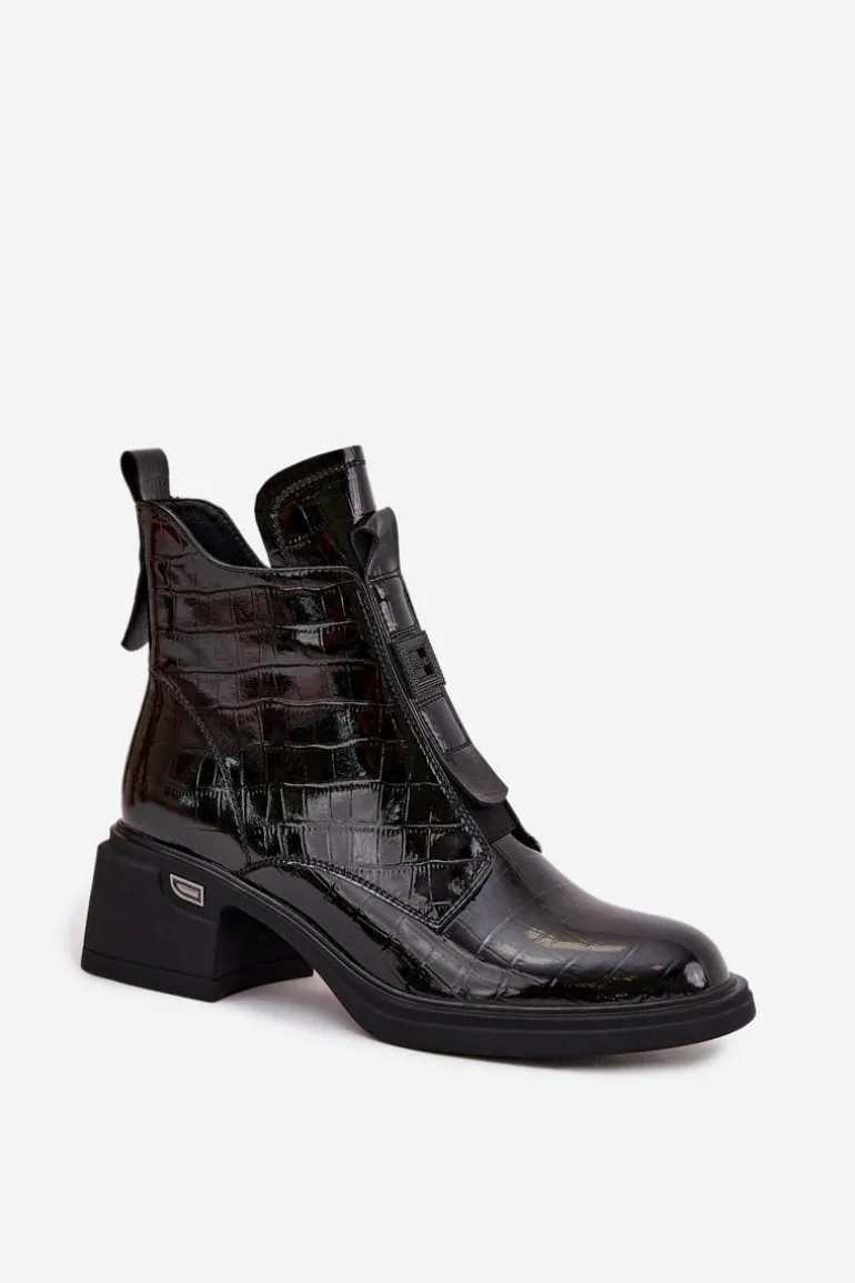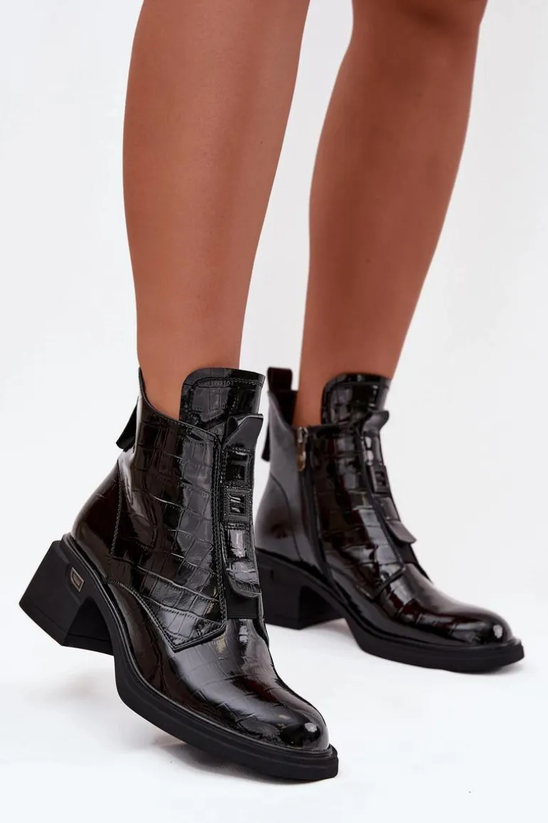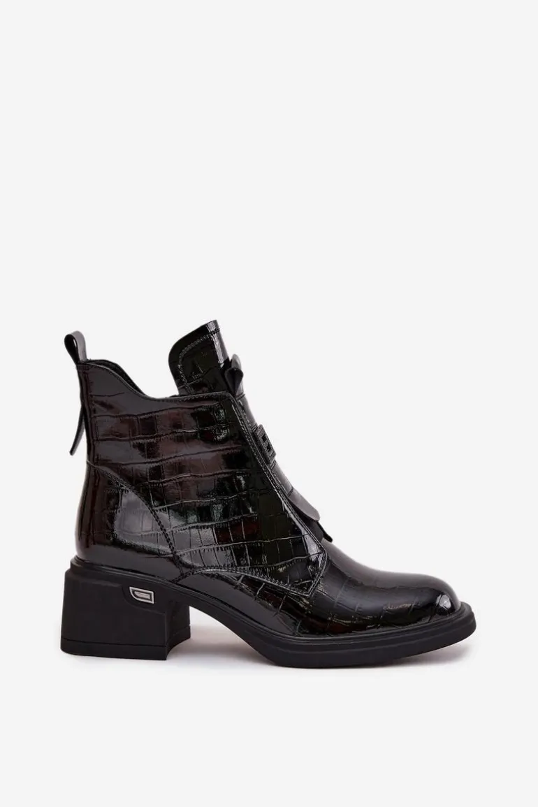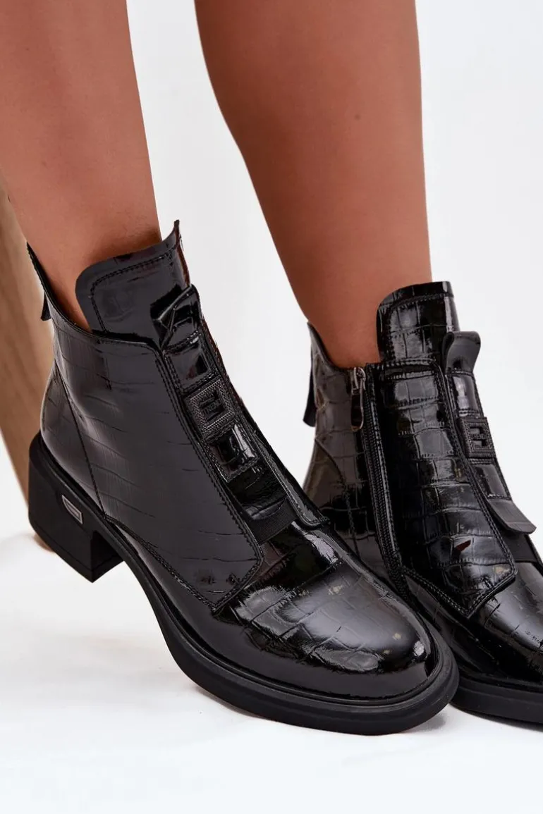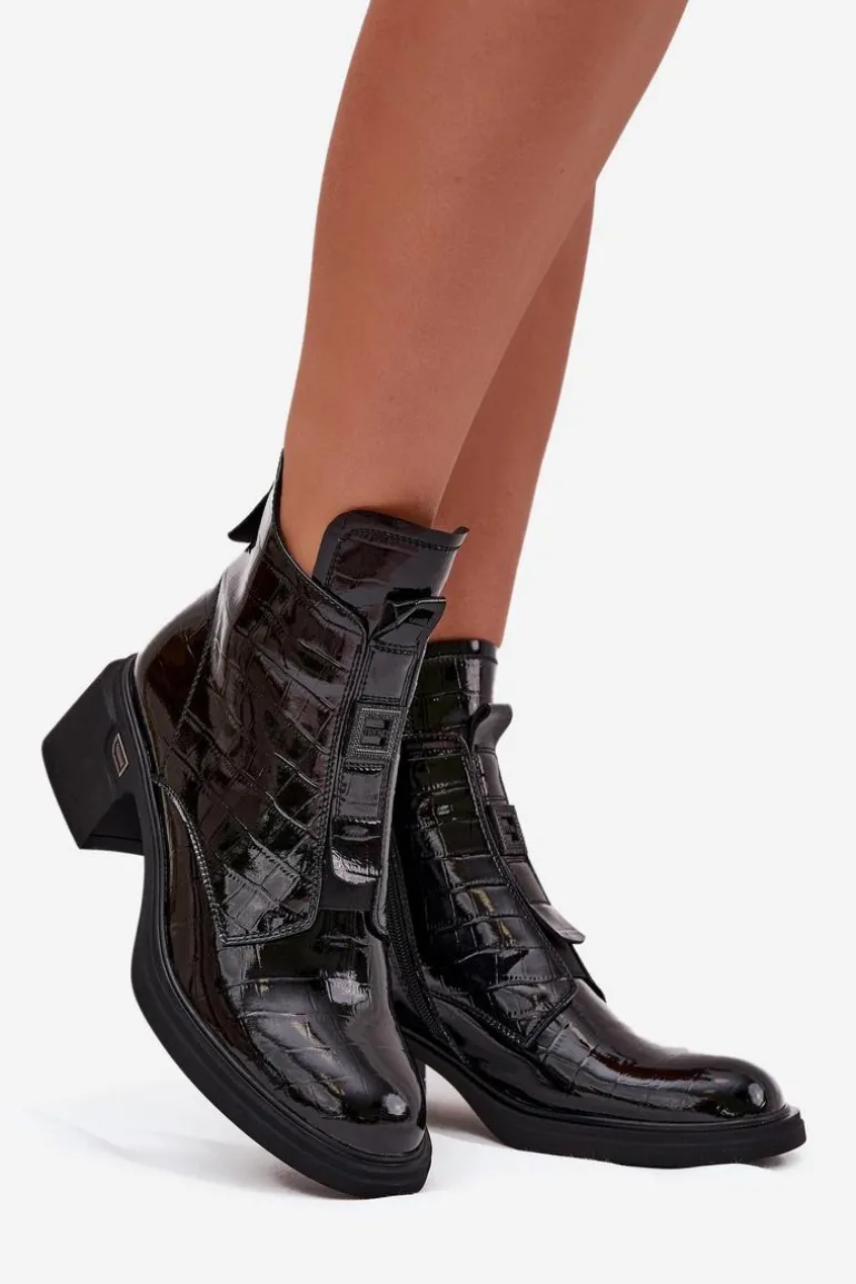 Botki damskie wykonane z lakierowanej skóry to połączenie elegancji i nowoczesnego stylu. Model osadzony na niskim obcasie typu klocek zapewnia stabilny i wygodny krok przez cały dzień, dzięki czemu świetnie sprawdzi się zarówno w pracy, jak i podczas codziennych aktywności. Botki są delikatnie ocieplane, co zapewnia komfort w chłodniejsze dni, nie obciążając przy tym stopy. Zamek z boku ułatwia szybkie zakładanie i zdejmowanie, a subtelne tłoczenie oraz mała ozdoba z przodu cholewki dodają butom wyjątkowego charakteru, wprowadzając elegancki, kobiecy akcent. To idealna propozycja dla pań, które cenią klasykę połączoną z modnymi detalami, pasującymi zarówno do casualowych, jak i bardziej formalnych stylizacji. Przy wyborze rozmiaru prosimy sugerować się tabelą rozmiarów.