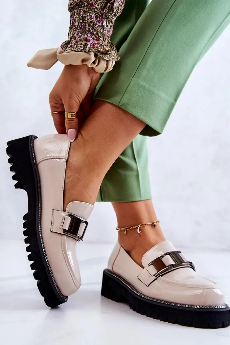 Cudne, wykonane z eko skóry półbuty w stylu loaferów! Ten fason idealnie sprawdzi się w sezonie wiosenno-jesiennym. Cholewka do kostki, z paskiem na przodzie przyozdobionym metalowym elementem. Nosek zaokrąglony. Podeszwa wykonana z tworzywa sztucznego z dużym bieżnikiem. Płaski obcas zapewni stabilność na każdym kroku. Miękka, wygodna wkładka została wykonana z naturalnej skóry. Ten model idealnie sprawdzi się zarówno w casualowych, jak i bardziej eleganckich outfitach! Przy wyborze rozmiaru prosimy sugerować się tabelą rozmiarów.