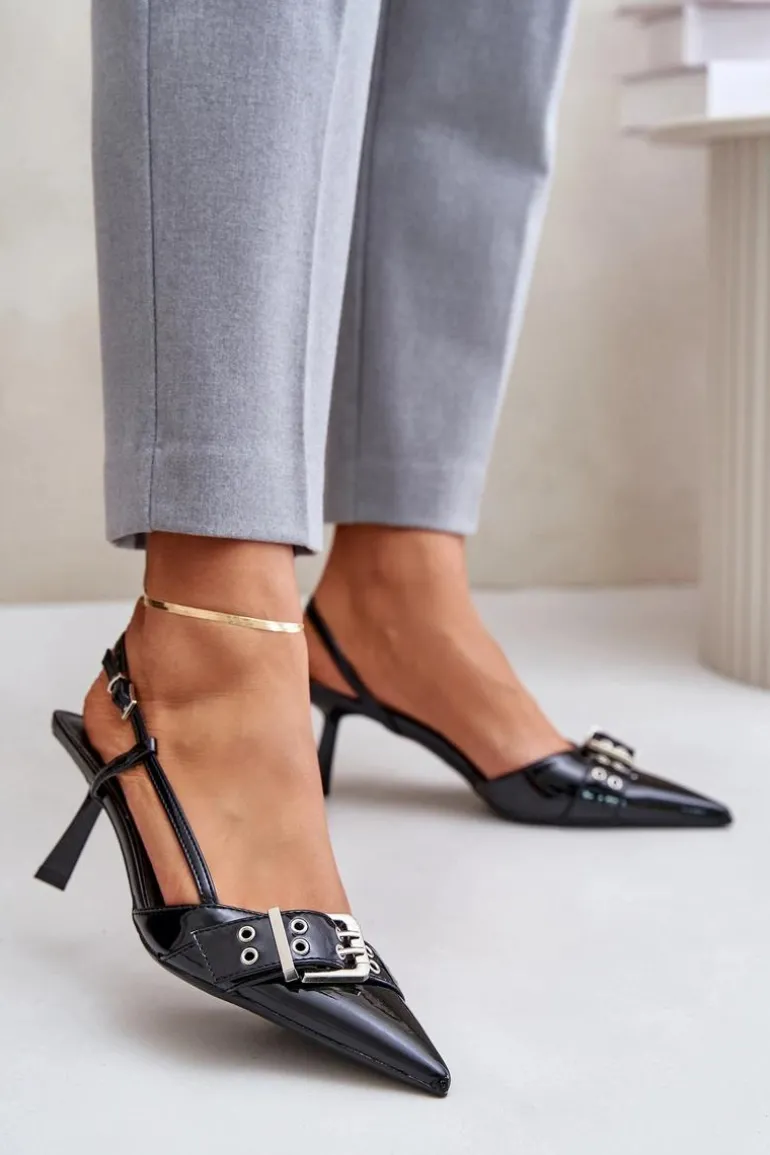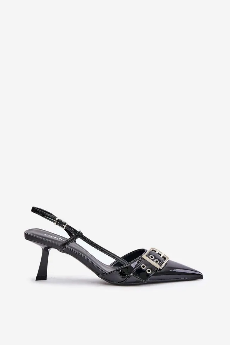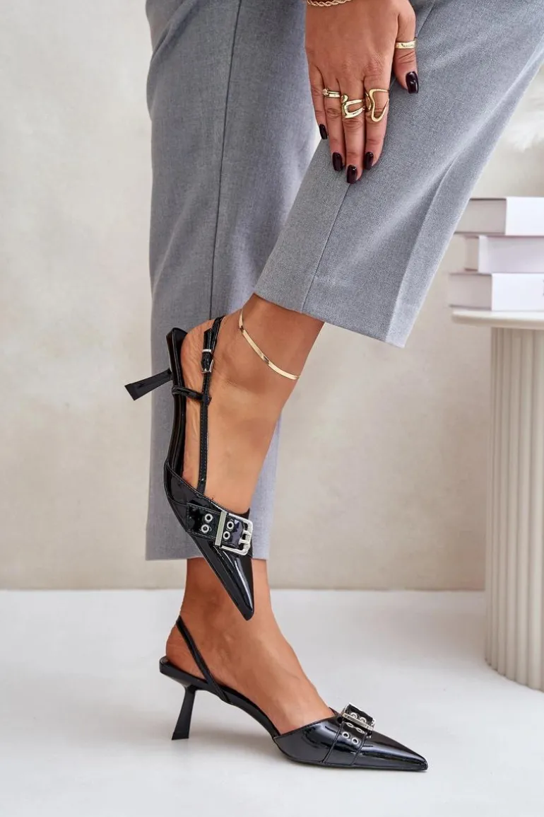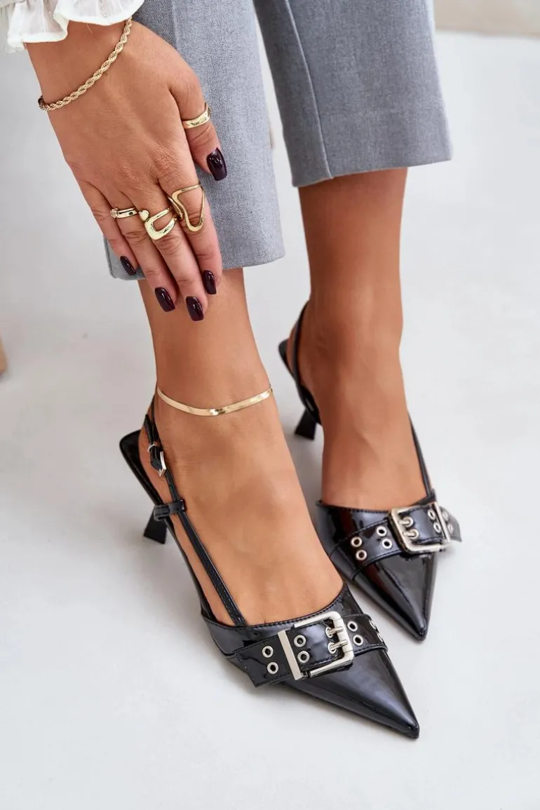 Lakierowane damskie szpilki wykonane z eko skóry to elegancka propozycja na specjalne okazje. Model charakteryzuje się spiczastymi noskami oraz regulowanym paskiem zapinanym na sprzączkę, co zapewnia idealne dopasowanie. Dodatkowym elementem ozdobnym jest stylowa klamra z przodu, która dodaje wyrazistości. Idealne do eleganckich sukienek i formalnych stylizacji. Przy wyborze rozmiaru prosimy sugerować się tabelą rozmiarów.