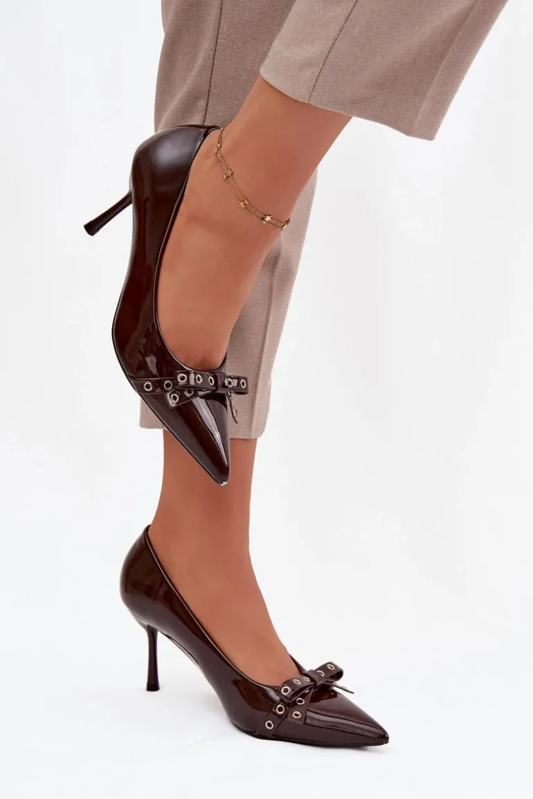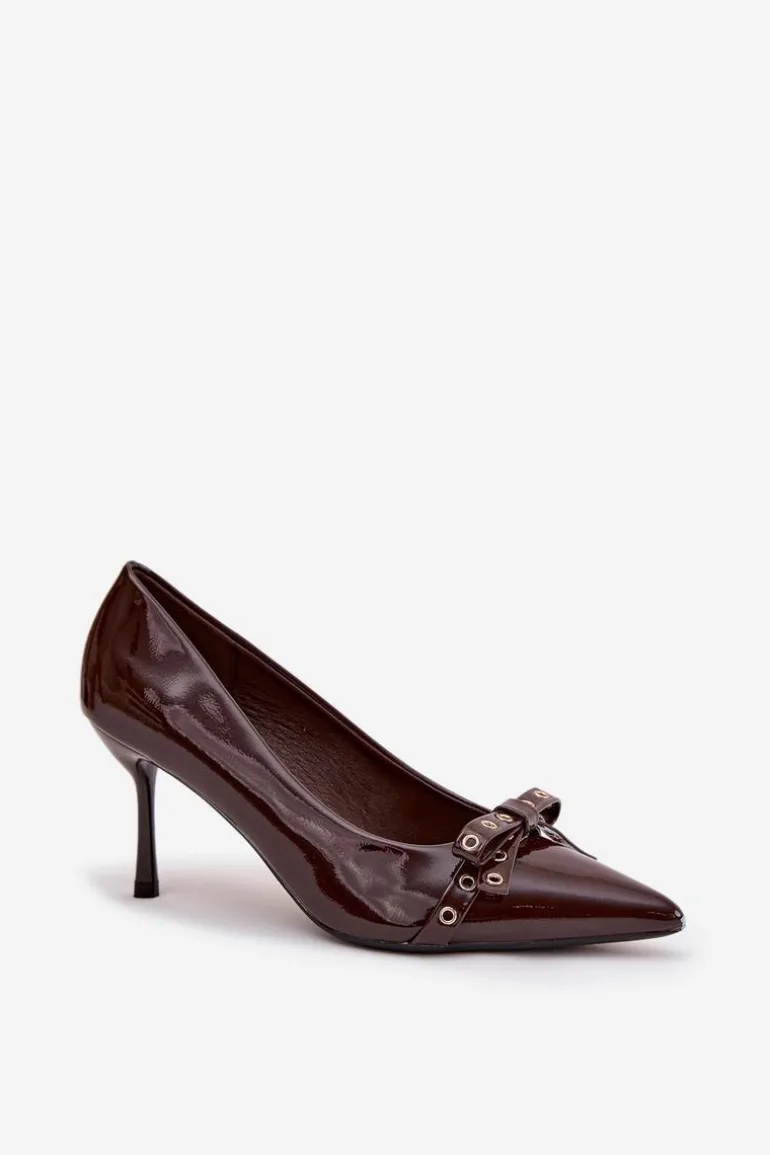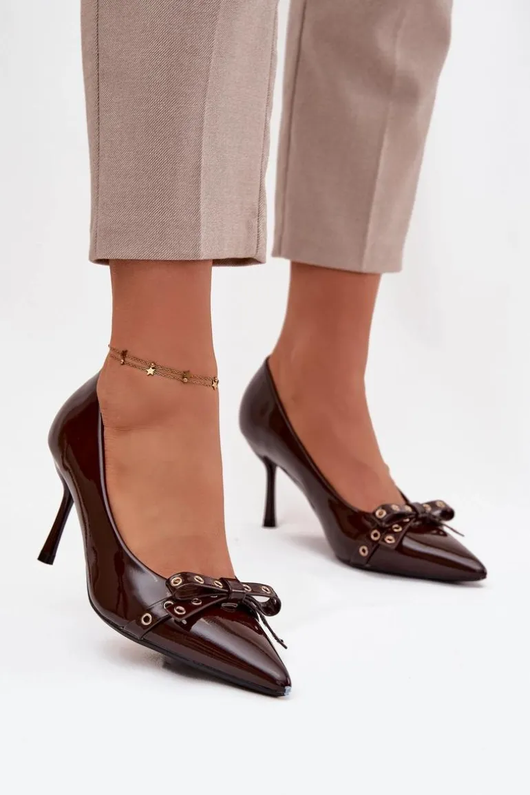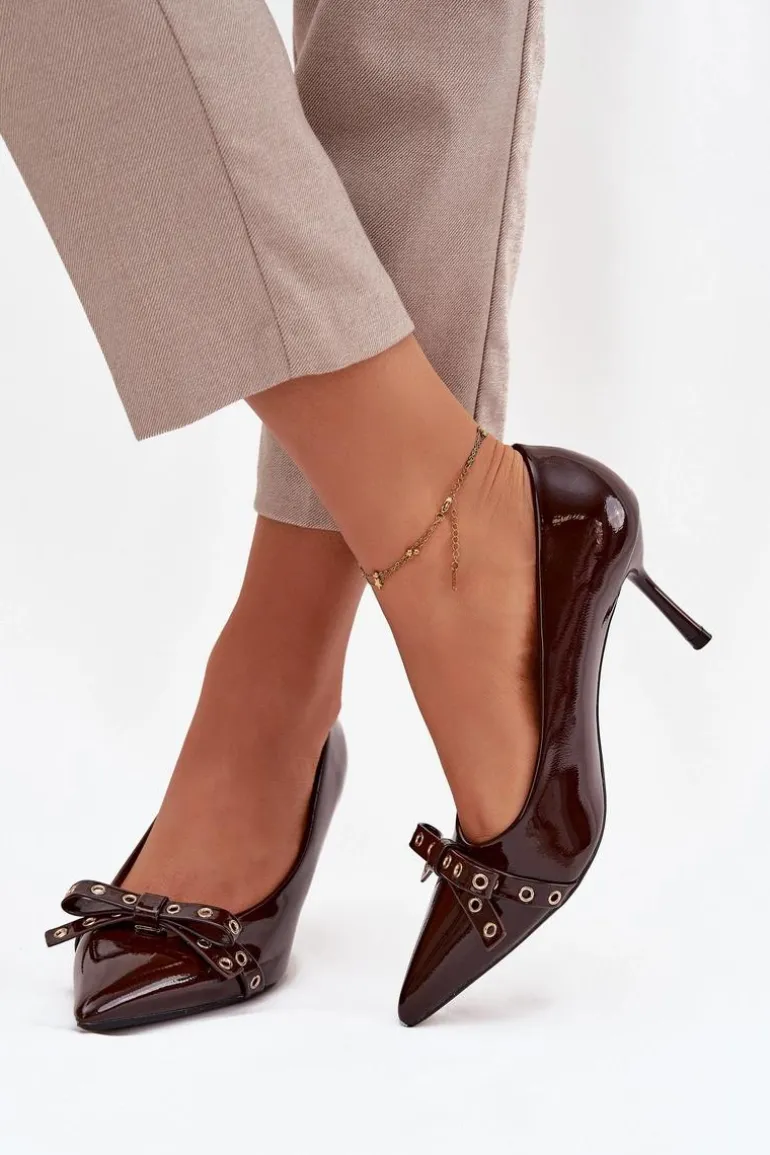 Klasyczne i pełne uroku szpilki wykonane z lakierowanej eko skóry to propozycja dla kobiet, które cenią elegancję i ponadczasowy styl. Błyszczące wykończenie dodaje im szyku, a szpiczasty nosek pięknie wysmukla nogi i podkreśla kobiecą sylwetkę. Na przodzie znajduje się ozdoba w formie delikatnej kokardki, która nadaje butom subtelnego, romantycznego charakteru. Smukła szpilka dodaje lekkości i elegancji, a jednocześnie zapewnia wyjątkowy wygląd przy każdej okazji. Te szpilki doskonale sprawdzą się zarówno do wieczorowych kreacji, jak i eleganckich stylizacji biurowych – zawsze wtedy, gdy chcesz wyglądać stylowo i czuć się wyjątkowo.