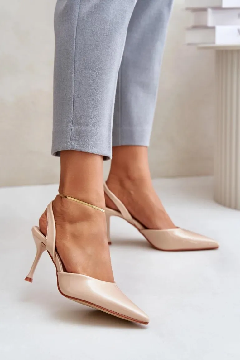 Szpilki z eko skóry to idealny wybór na specjalne okazje i wieczorne wyjścia. Klasyczne noski w szpic nadają im wyrafinowanego charakteru, optycznie wydłużając nogi. Z tyłu buta znajduje się pasek z gumką, który zapewnia lepsze dopasowanie do stopy, gwarantując komfort noszenia. Idealne do eleganckich sukienek oraz stylowych garniturów, te szpilki łączą w sobie szyk i wygodę. Przy wyborze rozmiaru prosimy sugerować się tabelą rozmiarów.