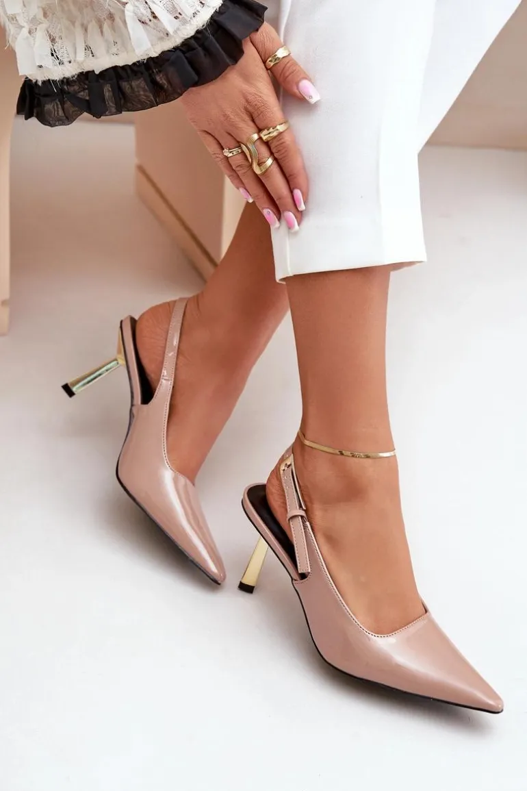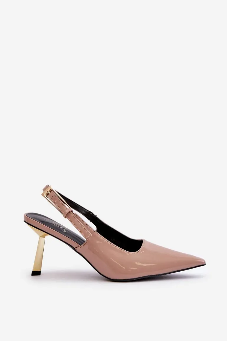 Eleganckie szpilki z lakierowanej eko skóry to wyjątkowy wybór dla miłośniczek stylowych akcentów. Model osadzony na ozdobnej, złotej szpilce dodaje szyku każdej stylizacji. Szpiczaste noski podkreślają elegancję butów, a regulowany pasek ze sprzączką zapewnia wygodne i pewne dopasowanie. Idealne na wyjątkowe okazje, doskonale dopełnią wieczorowe i koktajlowe kreacje. Przy wyborze rozmiaru prosimy sugerować się tabelą rozmiarów.