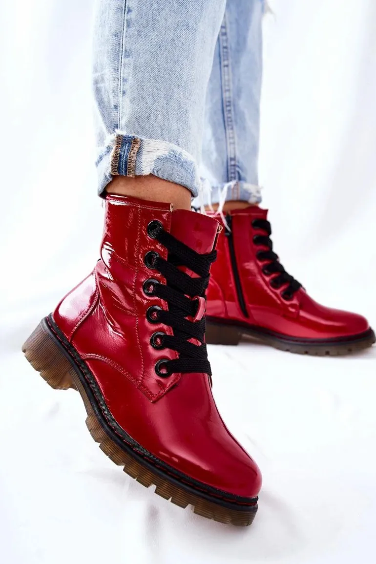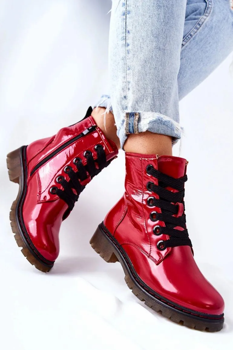Modne botki wykonane z lakierowanej skóry ekologicznej. Botki posiadają suwak na boku cholewki oraz wiązanie, które ułatwiają zakładanie. Wnętrze zostało ocieplone delikatnym kocem obuwniczym. Ozdobne szycia przy podeszwie. Nie czekaj aż znikną! Przy wyborze rozmiaru prosimy sugerować się tabelą rozmiarów.