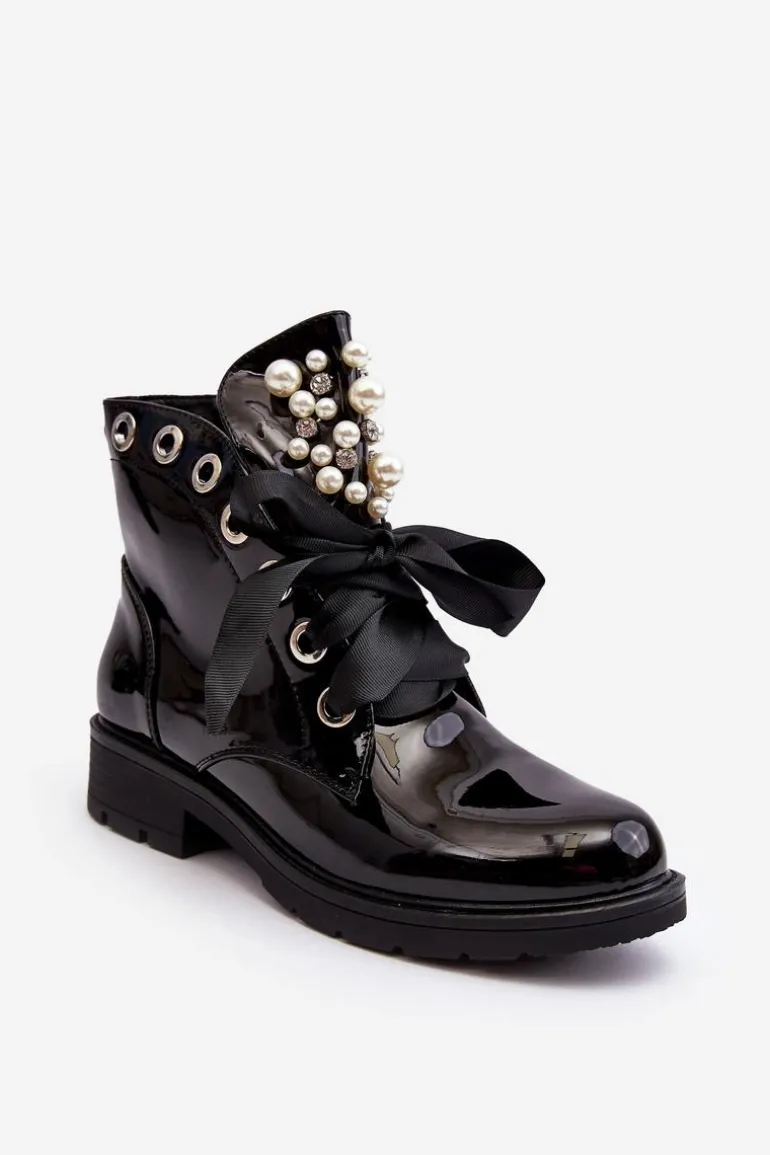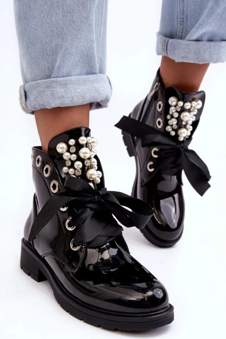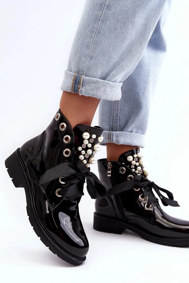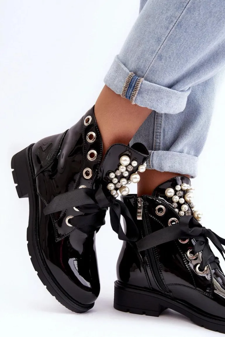 Modne damskie botki na płaskim, stabilnym obcasie. Wykonane z eko skóry. Model ten zapinany jest na suwak po wewnętrznej stronie cholewki oraz dodatkowo posiada sznurówki. Z przodu zdobienie w postaci sztucznych pereł oraz dżetów. Wnętrze ocieplone kocem obuwniczym. Zapiętek jest usztywniony. Świetnie sprawdzą się do wielu stylizacji! Przy wyborze rozmiaru prosimy sugerować się tabelą rozmiarów.