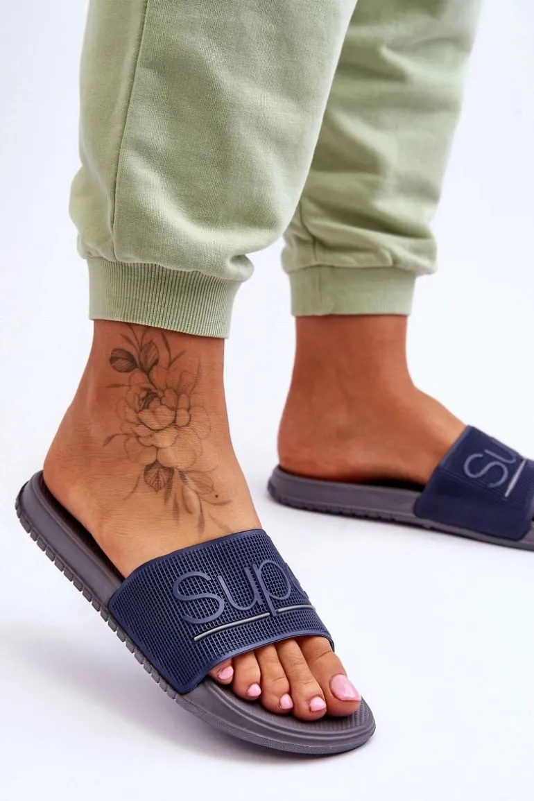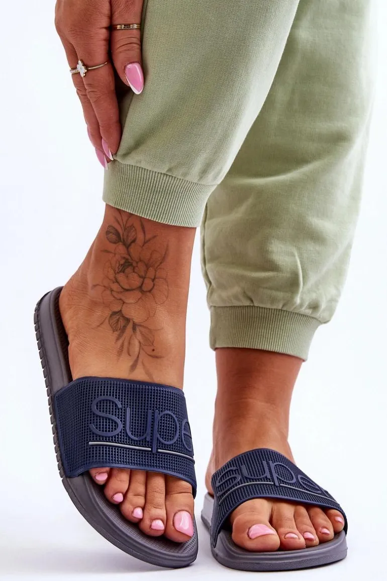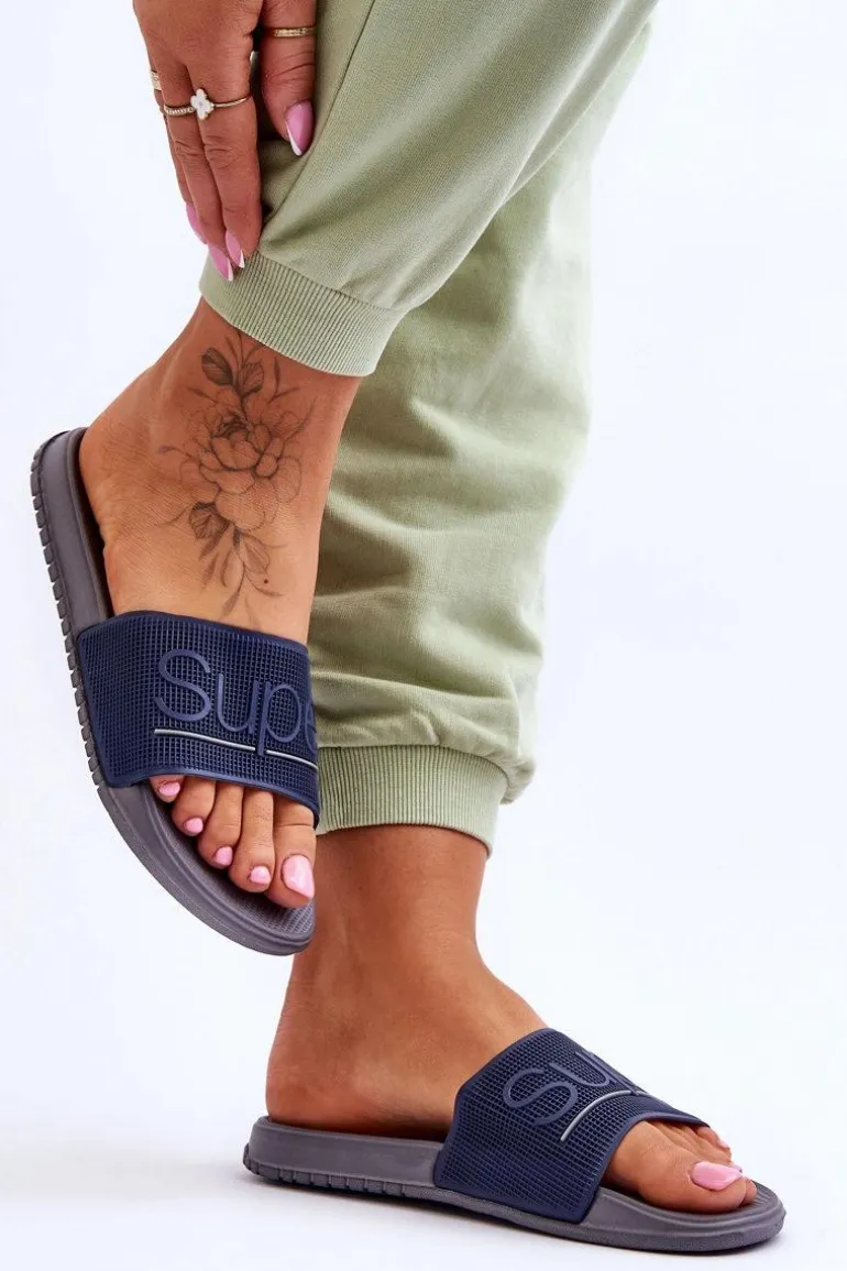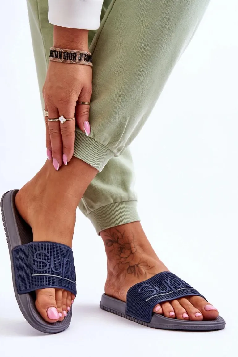 Lekkie Damskie Klapki Z Napisem Granatowo-Szare Merry