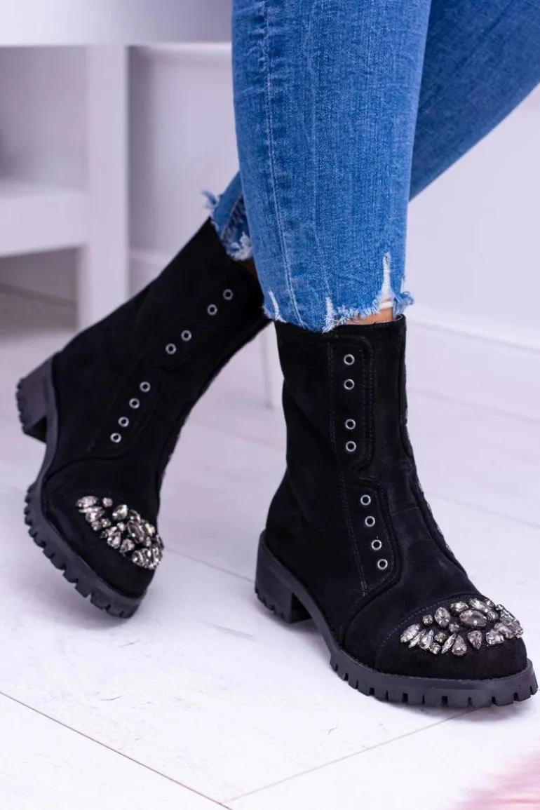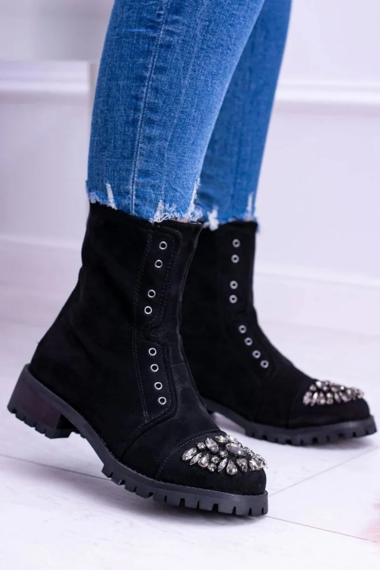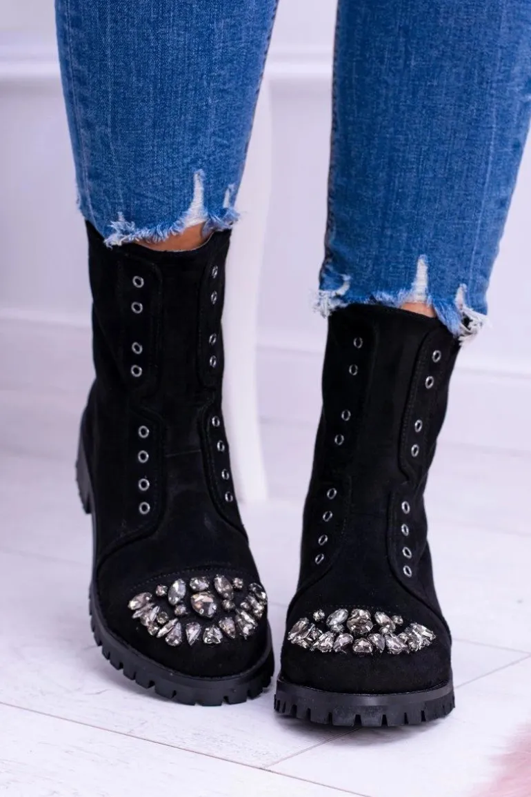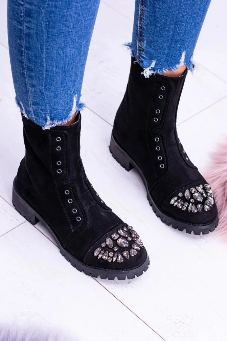 Lu Boo | Czarne Damskie Botki Za Kostkę Cyrkonie Zamsz Carrie