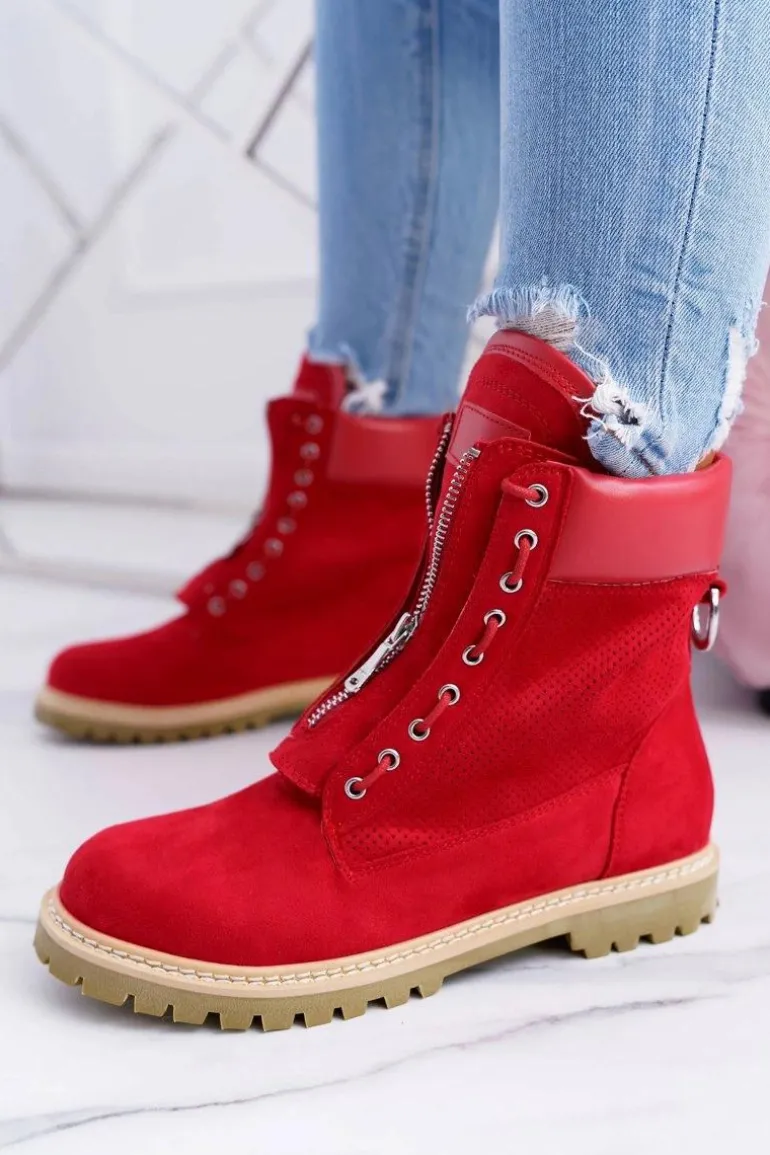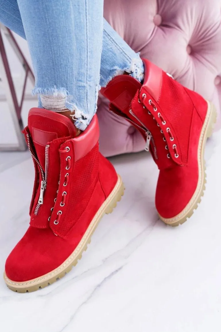 Lu Boo Damskie Czerwone Zamszowe Timberki Trapery Suwaki Nancy