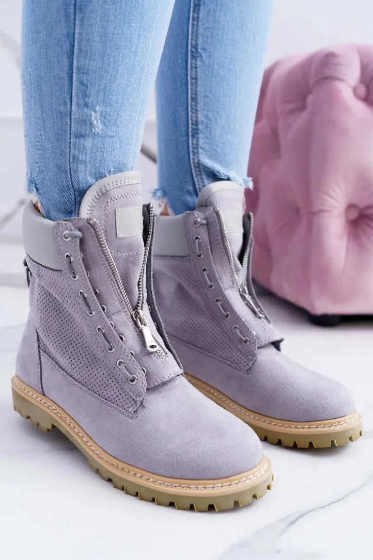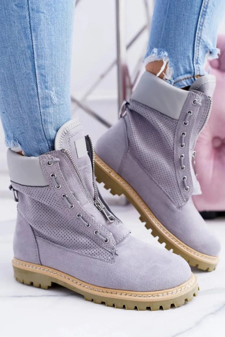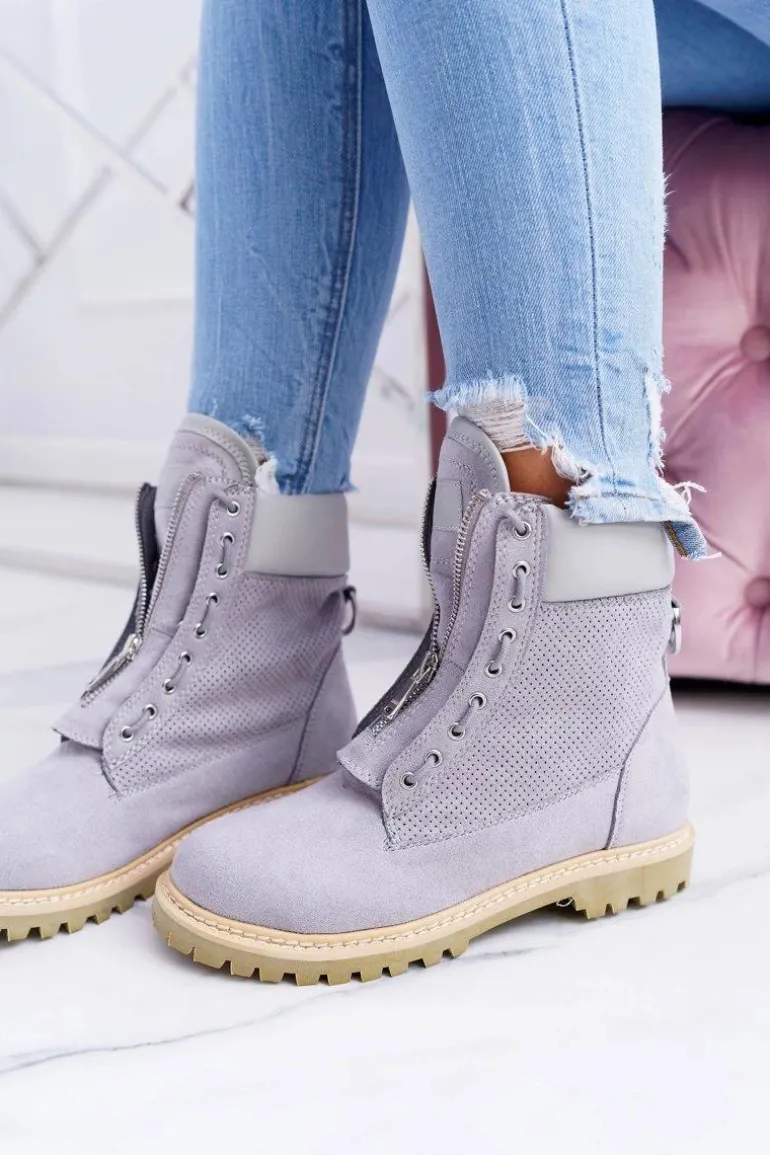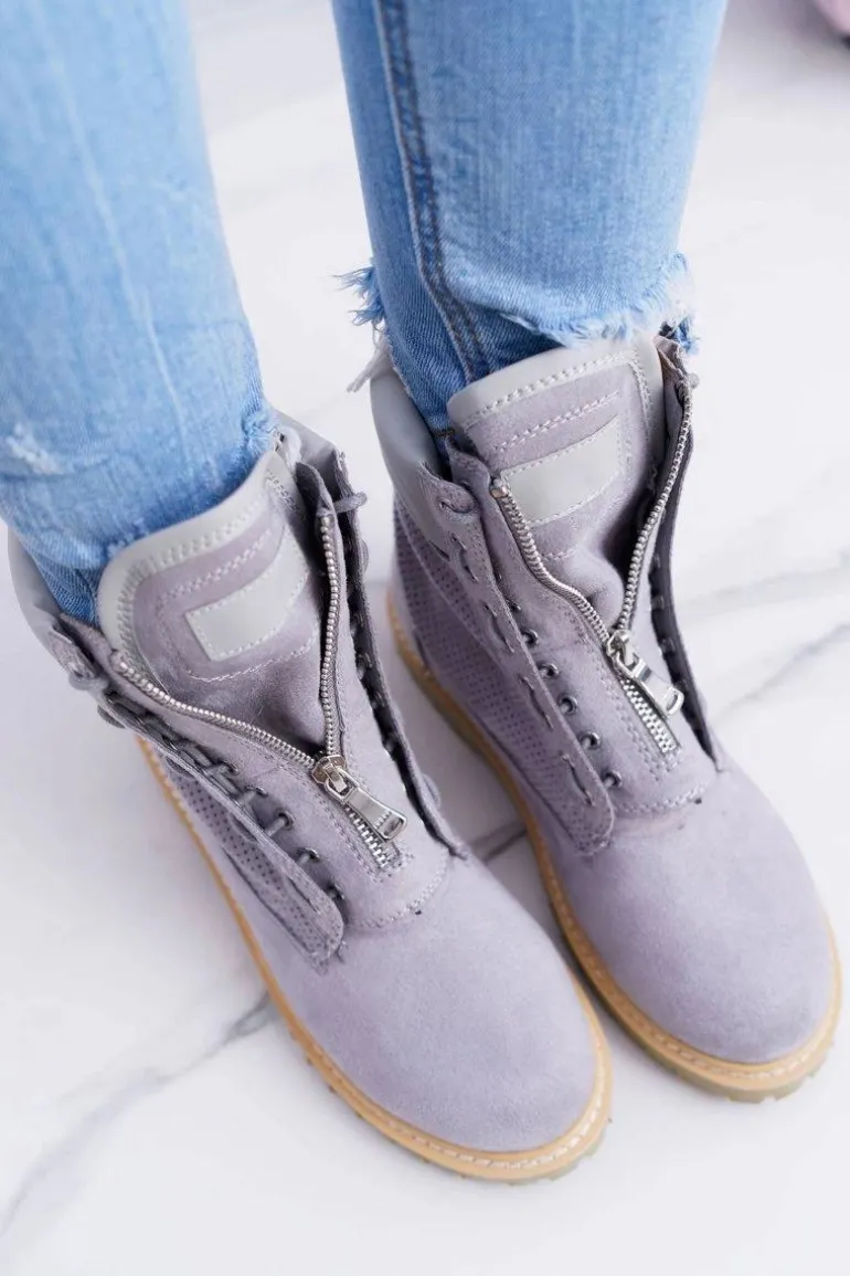 Lu Boo Damskie Szare Zamszowe Timberki Trapery Suwaki Nancy