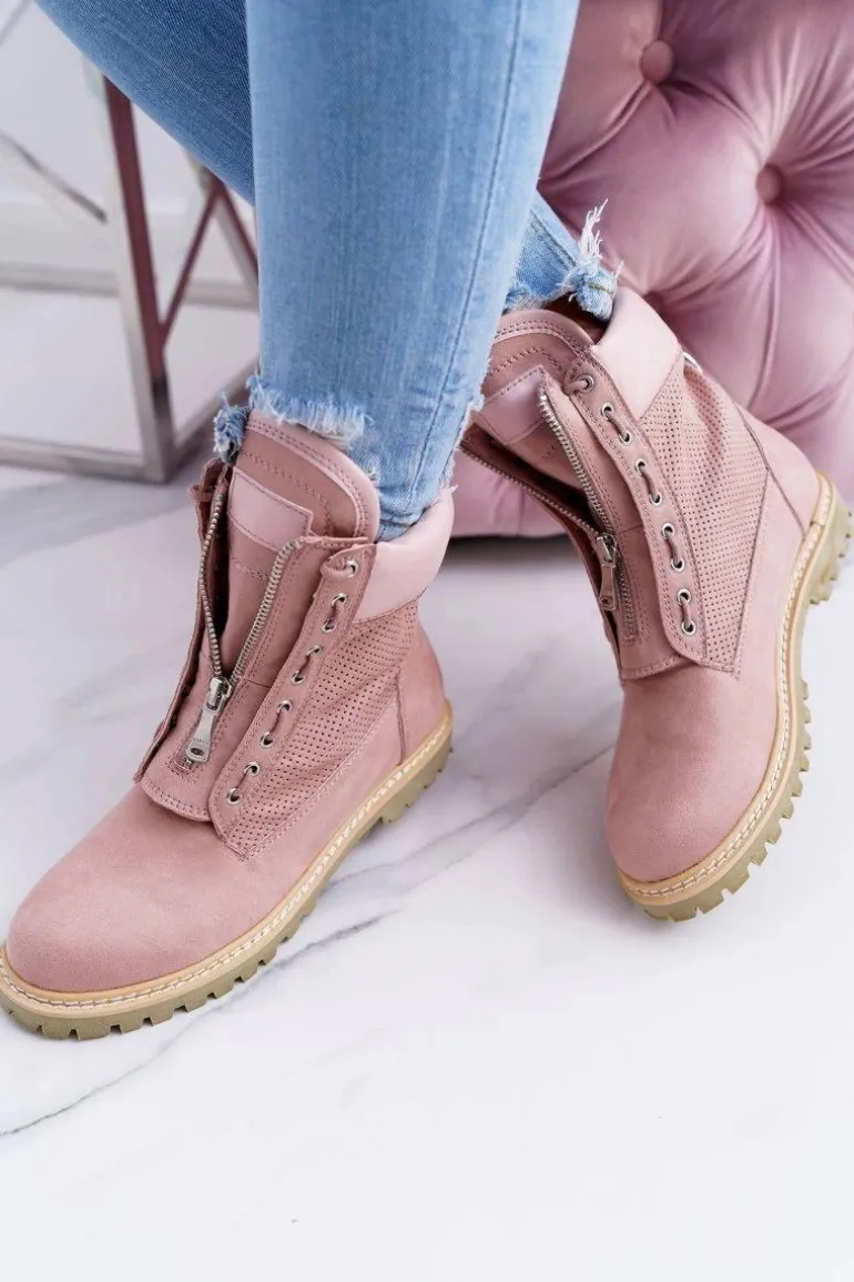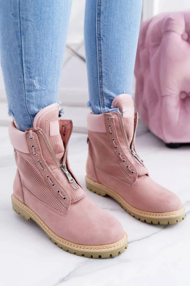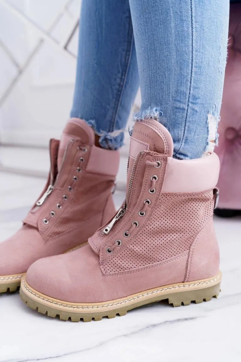 Lu Boo Damskie Zamszowe Timberki Pudrowy Róż Trapery Suwaki Nancy