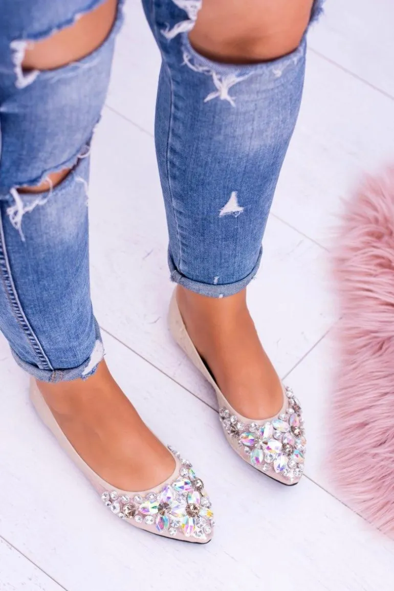 Balerinki wpisały się w gusta kobiet i stały się nieodłącznym elementem stylizacji przez cały rok. Dzięki pięknym zdobieniom pasują doskonale do wyjątkowych stylizacji. Balerinki posiadają duże kamienie oraz wszytą gumkę, która zapewni odpowiednie dopasowanie do stopy. Nie zapomnieliśmy także o wygodzie, wykonane są z bardzo delikatnego w dotyku materiału, a wewnątrz znajduję się miła dla stopy skórzana wkładka. My jesteśmy nimi zauroczone, a Ty?