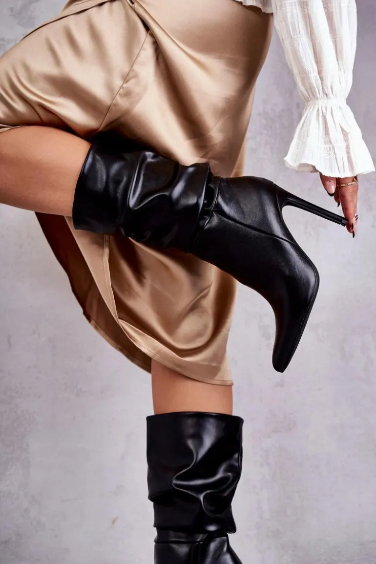 Modne kozaki damskie wykonane z eko skóry. Cholewka z marszczeniem podkreśli Twoje stylizacje! Kozaki zostały osadzone na obcasie w postaci szpilki. Nosek w szpic dodatkowo wysmukli nogi. Model wsuwany z usztywnianym zapiętkiem. Idealnie będą komponować się z plisowanymi spódnicami czy dzianinowymi sukienkami. Koniecznie sprawdź także pozostałe modele dostępne w naszej ofercie! Przy wyborze rozmiaru prosimy sugerować się tabelą rozmiarów.