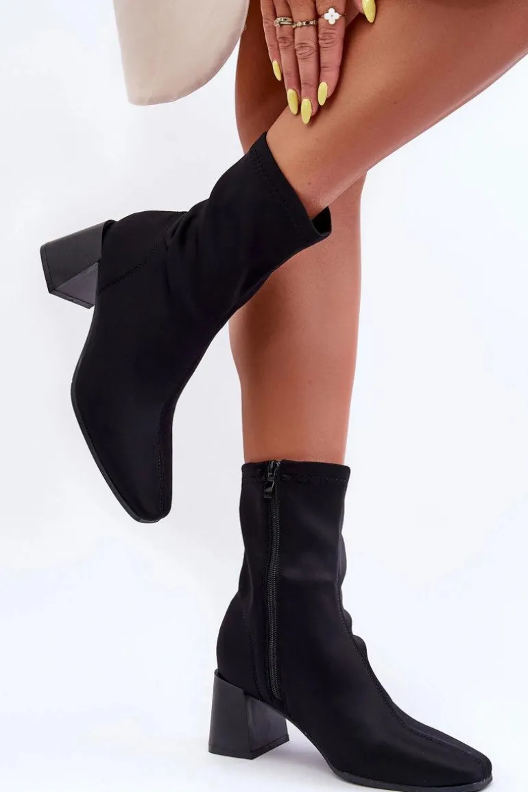 Botki damskie z materiałową cholewką z pewnością sprawdzą się w wielu stylizacjach! Zostały osadzone na niewysokim obcasie w postaci słupka. Na boku cholewki znajduje się zamek ułatwiający zakładanie obuwia. Dodatkowo botki posiadają usztywniany zapiętek. Wkładka w tym obuwiu została wykonana z eko skóry. Przy wyborze rozmiaru prosimy sugerować się tabelą rozmiarów.