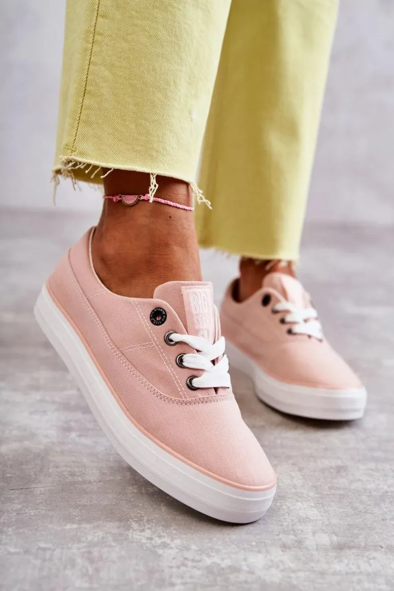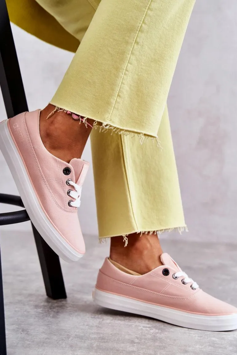 Niskie damskie trampki zostały wykonane z materiału tekstylnego. Buty posiadają okrągły, miękki nosek. Delikatnie usztywniany zapiętek. Model ten posiada sznurowanie pozwalające na odpowiednie dopasowanie obuwia do tęgości nogi. Dodatkowo tenisówki posiadają antypoślizgową, gumową podeszwę. Model ten świetnie sprawdzi się na co dzień do pracy czy szkoły. Przy wyborze rozmiaru prosimy sugerować się tabelą rozmiarów.