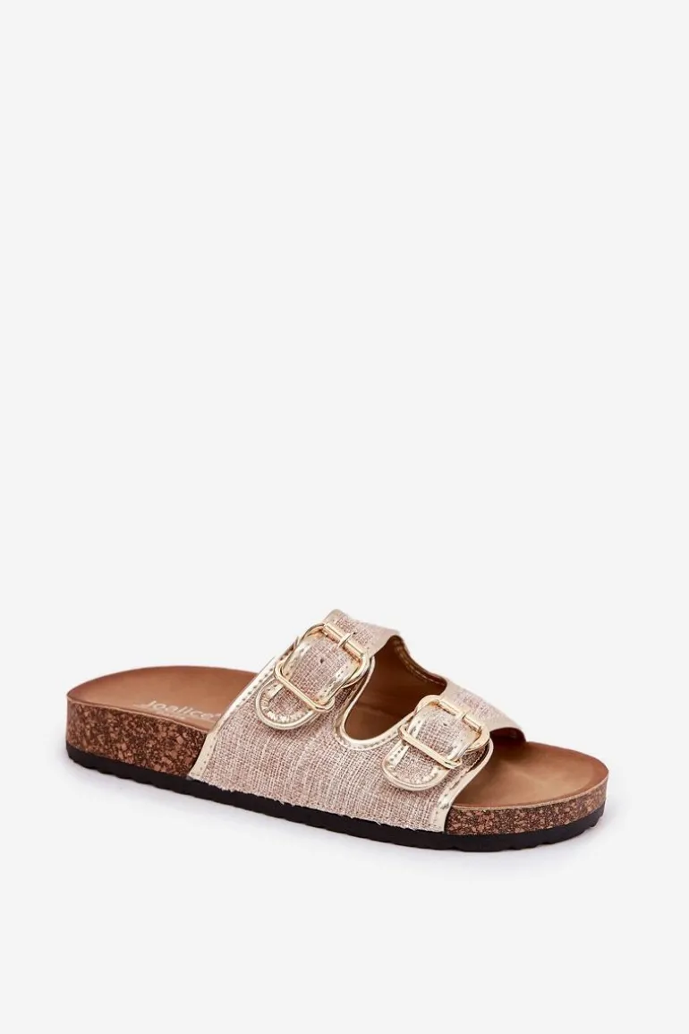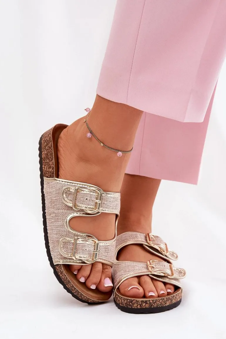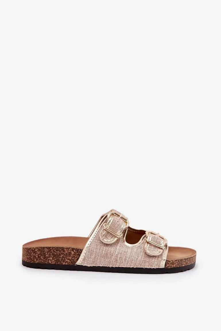 Materiałowe Klapki Damskie Na Korkowej Platformie Z Klamrami Złote Osoffe