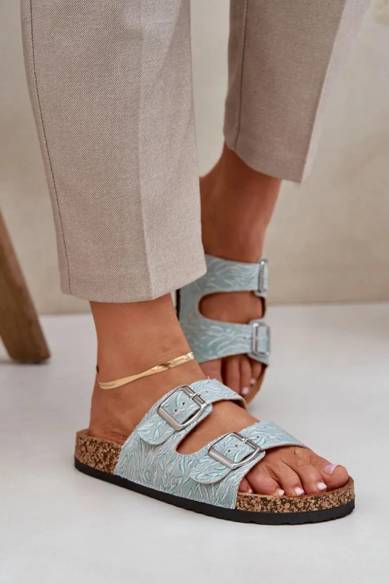 Materiałowe Klapki Na Korkowej Podeszwie Z Klamrami Miętowe Atera