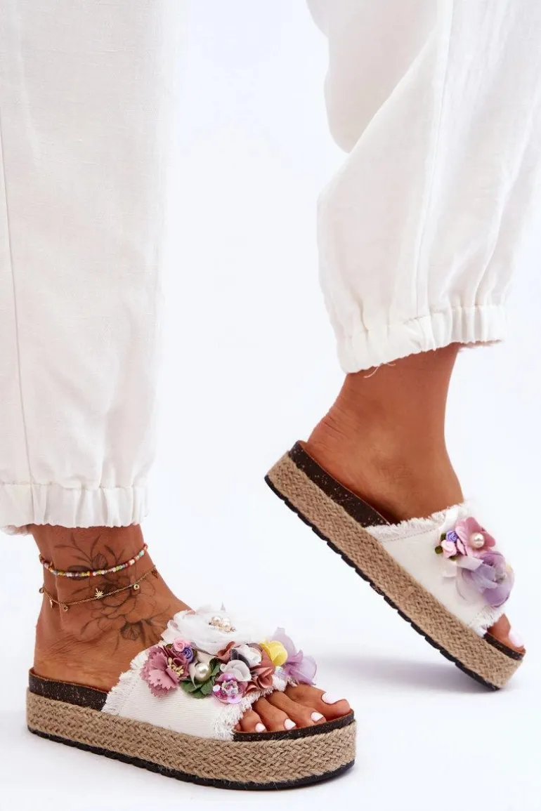 Niepowtarzalne, damskie klapki z cudnymi ozdobami w postaci materiałowych kwiatów i perełek. Osadzone na masywnej platformie ozdobionej jutową plecionką. Klapki posiadają profilowaną, eko zamszową wkładkę. Ten model z pewnością wyróżni Cię z tłumu! Przy wyborze rozmiaru prosimy sugerować się tabelą rozmiarów.