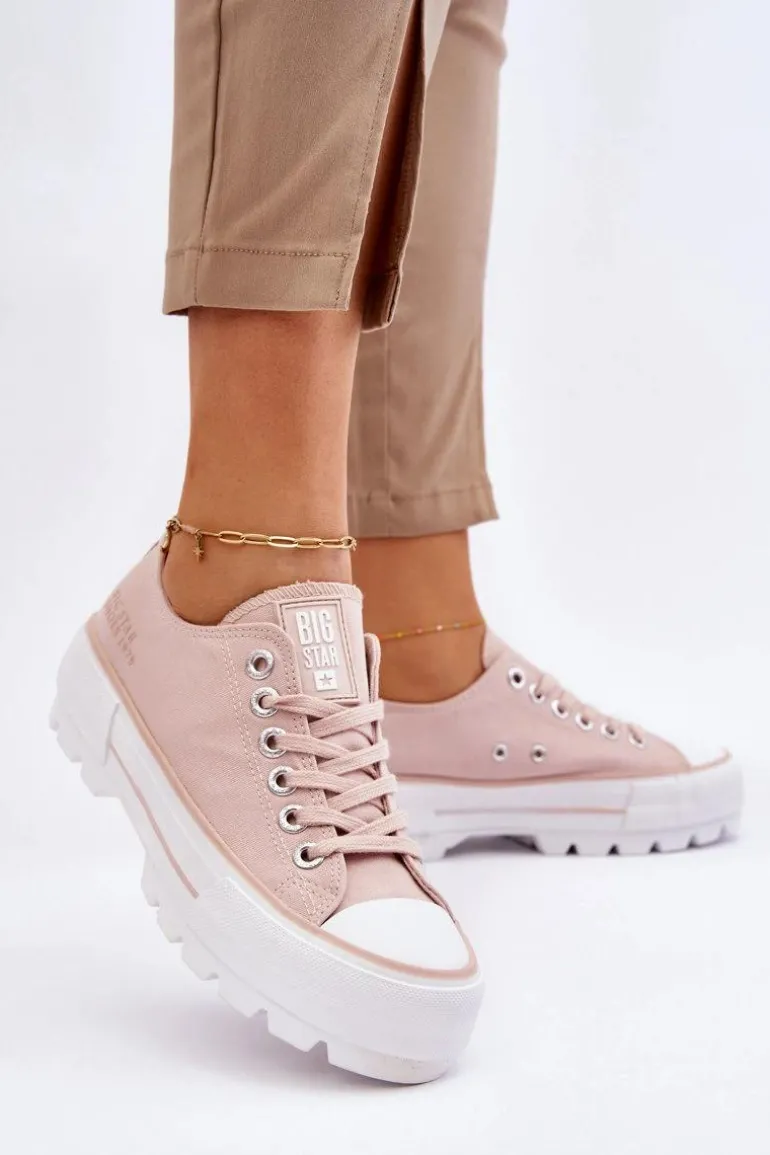 Modne trampki damskie od marki Big Star! Nowoczesny design oraz podeszwa z wysokim bieżnikiem wyróżnia ten model spośród innych! Cholewka wykonana z materiału tekstylnego. Trampki te dodatkowo posiadają delikatnie usztywniany zapiętek. Platforma wraz z podeszwą zostały wykonane z gumowego tworzywa. Przy wyborze rozmiaru prosimy sugerować się tabelą rozmiarów.