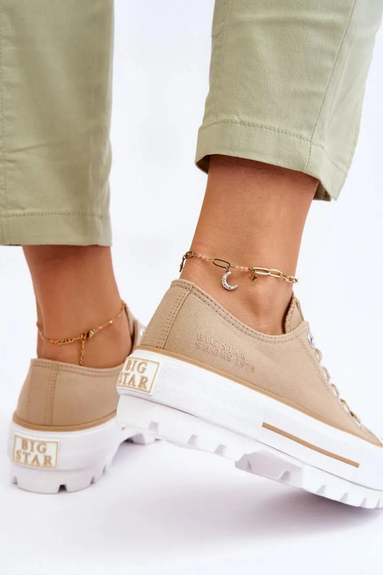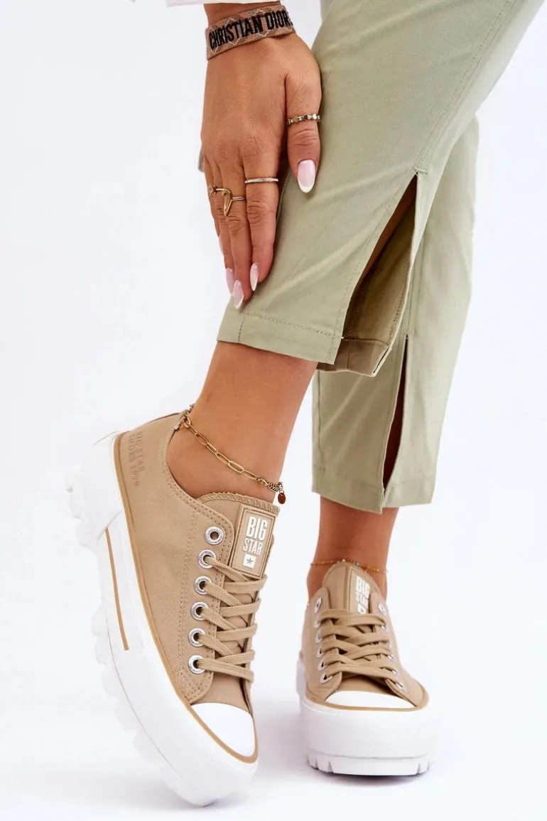 Modne trampki damskie od marki Big Star! Nowoczesny design oraz podeszwa z wysokim bieżnikiem wyróżnia ten model spośród innych! Cholewka wykonana z materiału tekstylnego. Trampki te dodatkowo posiadają delikatnie usztywniany zapiętek. Platforma wraz z podeszwą zostały wykonane z gumowego tworzywa. Przy wyborze rozmiaru prosimy sugerować się tabelą rozmiarów.
