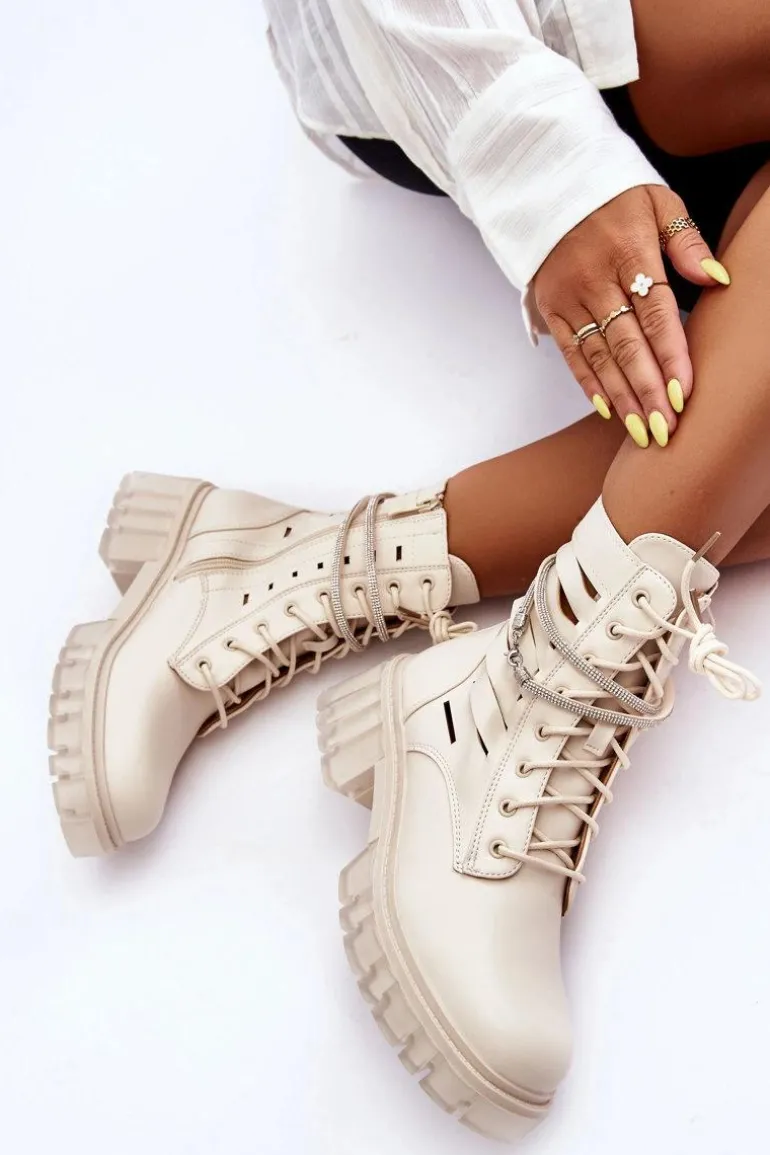 Niezwykłe i stylowe botki wykonane z eko skóry. Zapinane są z boku cholewki na zamek oraz dodatkowo sznurowane. Botki posiadają usztywniany zapiętek. Ozdobny, odpinany paseczek został wzbogacony dżetami imitującymi cyrkonie. Botki zostały wykonane z eko skóry z modnymi przecięciami. Osadzono je na masywnym, płaskim obcasie i platformie. Przy wyborze rozmiaru prosimy sugerować się tabelą rozmiarów.