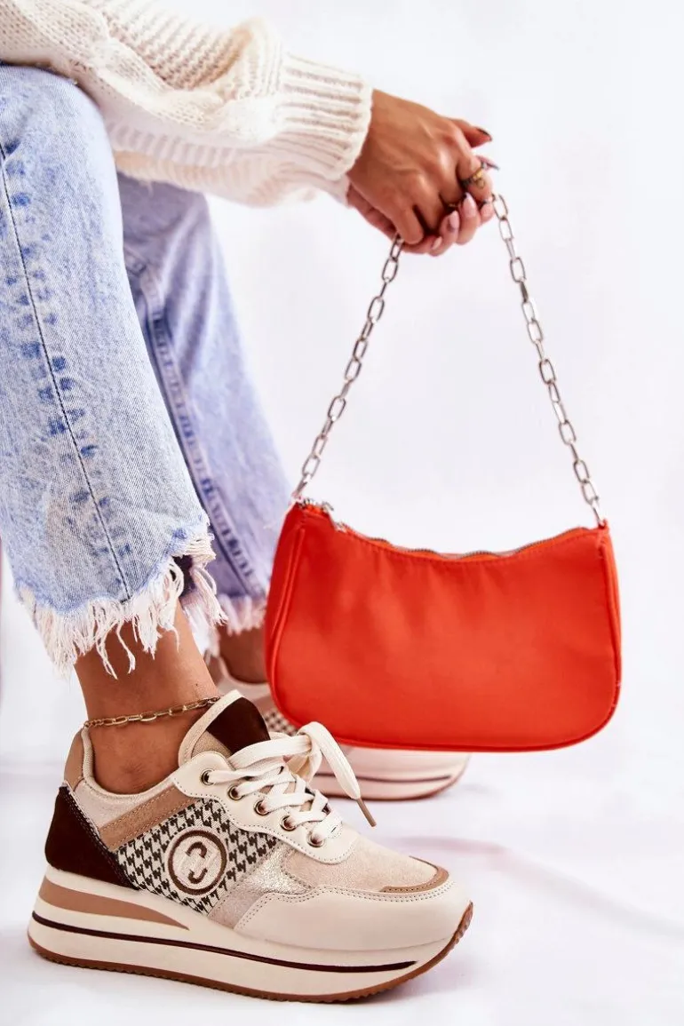 Wygodne sportowe buty damskie zostały wykonane połączenia kilku tkanin, m.in.: eko skóry oraz eko zamszu. Model ten posiada ozdobny emblemat wyszyty na boku cholewki. Buty posiadają delikatnie usztywniany zapiętek. Klasycznie sznurowane. Osadzone na platformie oraz koturnie. Dodatkowo podeszwa jest wykonana z gumowego tworzywa, antypoślizgowa. Przy wyborze rozmiaru prosimy kierować się tabelą rozmiarów.
