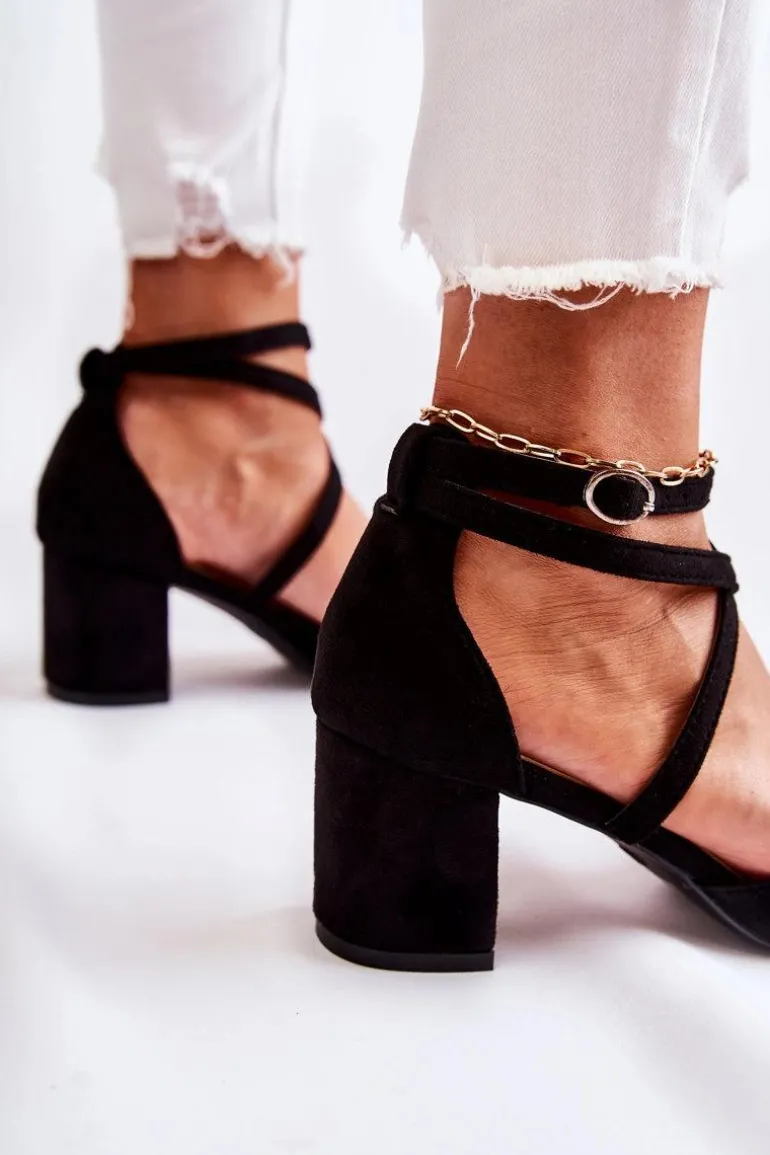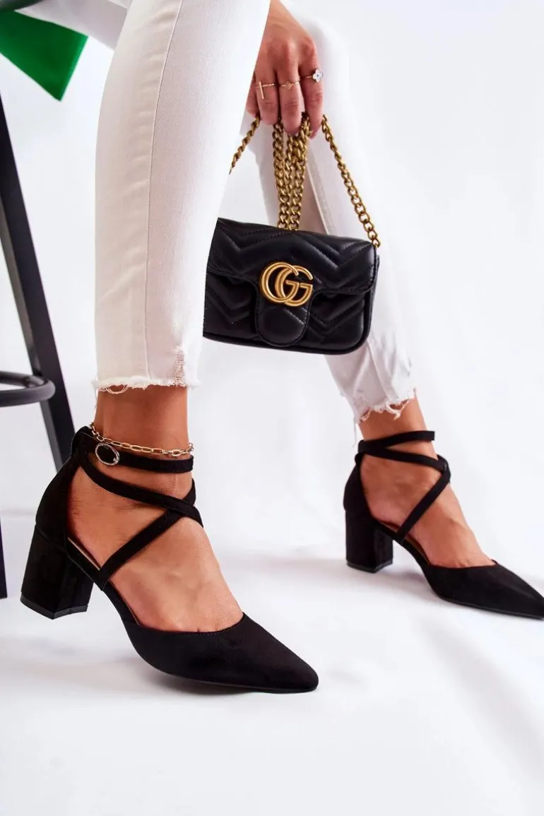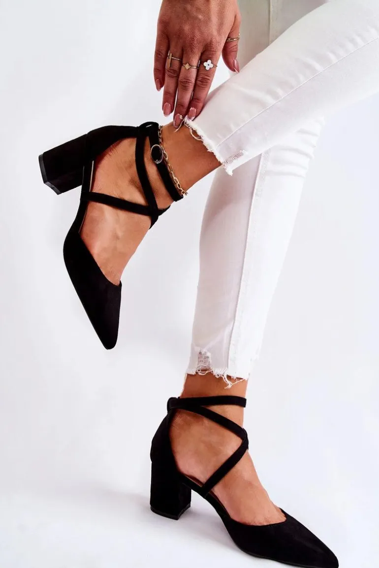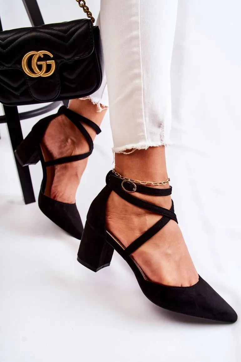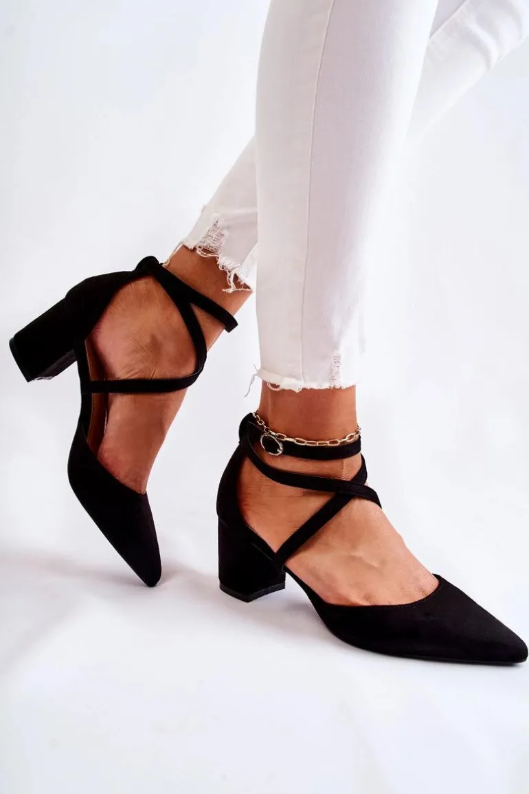 Czółenka na niskim, stabilnym obcasie w postaci słupka. Zapinane na regulowany pasek ze sprzączką znajdującą się na wysokości kostki. Model z noskiem w szpic. Wykonane z eko zamszu, natomiast wkładka wykonana z eko skóry. Modne paseczki krzyżują się na środku. Buty te posiadają usztywniany zapiętek. Idealne do sukienek czy eleganckich kombinezonów. Świetnie sprawdzą się podczas wielu uroczystości. Przy wyborze rozmiaru prosimy sugerować się tabelą rozmiarów.