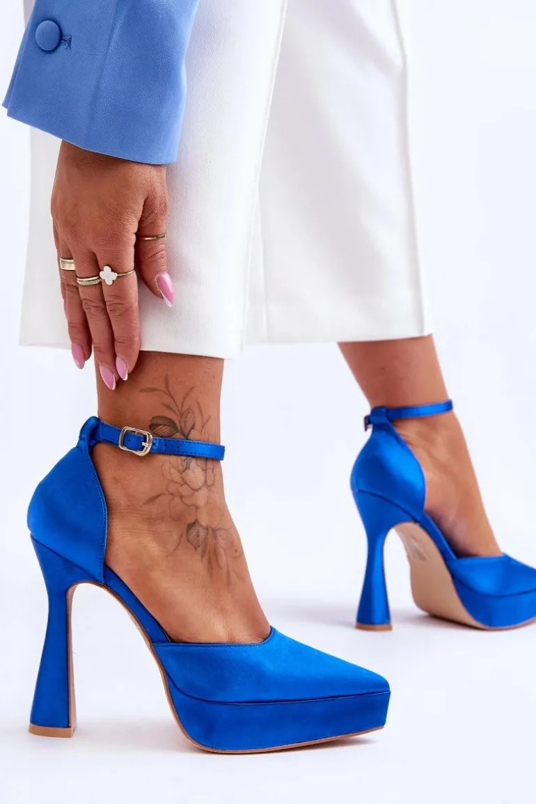 Modne czółenka na obcasie w postaci rozszerzonej ku dołowi szpilce oraz masywnej platformie z pewnością przypadną do gustu kobietom kochającym wysokie obcasy! Wierzch obuwia został wykonany z materiału tekstylnego imitującego satynę. Miękka wkładka z eko skóry pozwoli na komfortowe użytkowanie. Czółenka są zapinane wokół kostki na sprzączkę z regulowanym paskiem. Przy wyborze rozmiaru prosimy kierować się tabelą rozmiarów