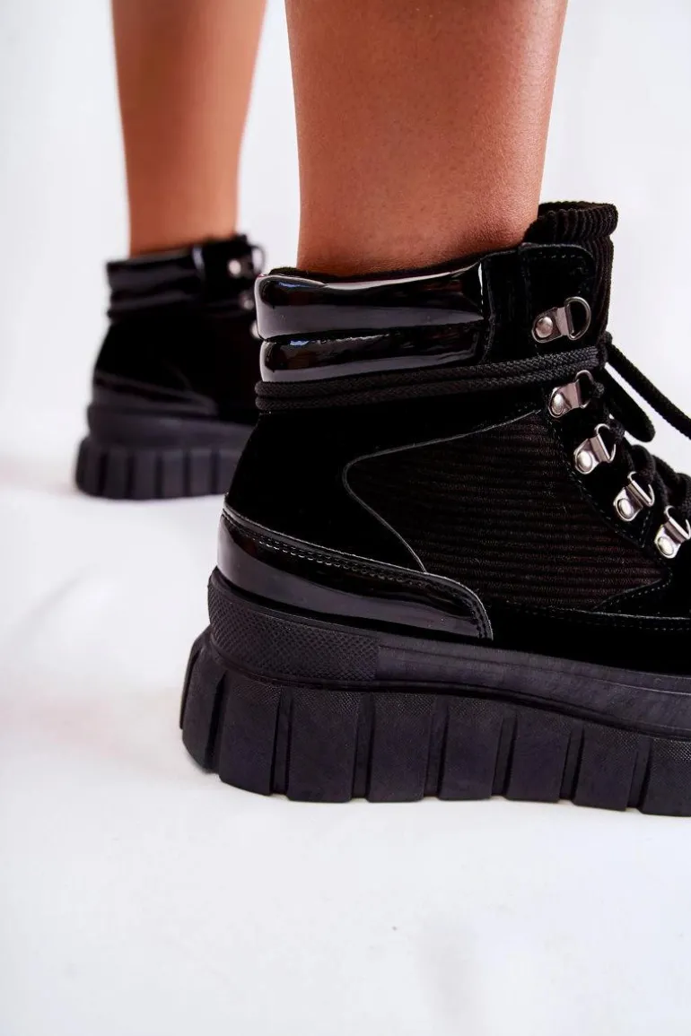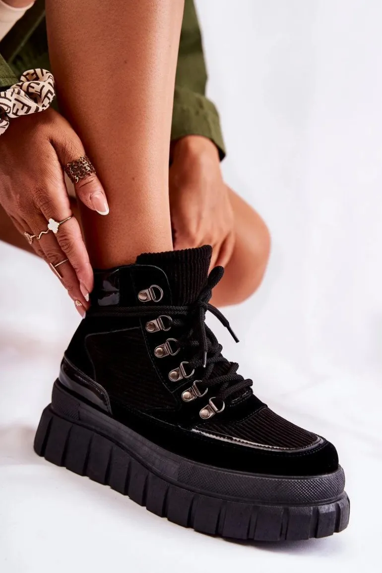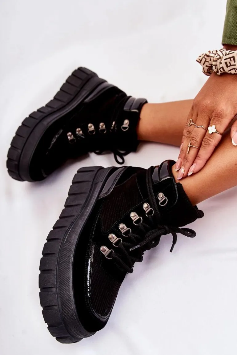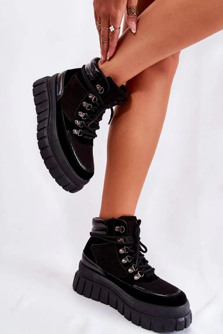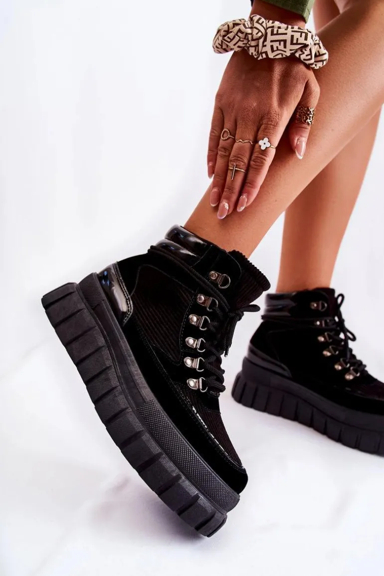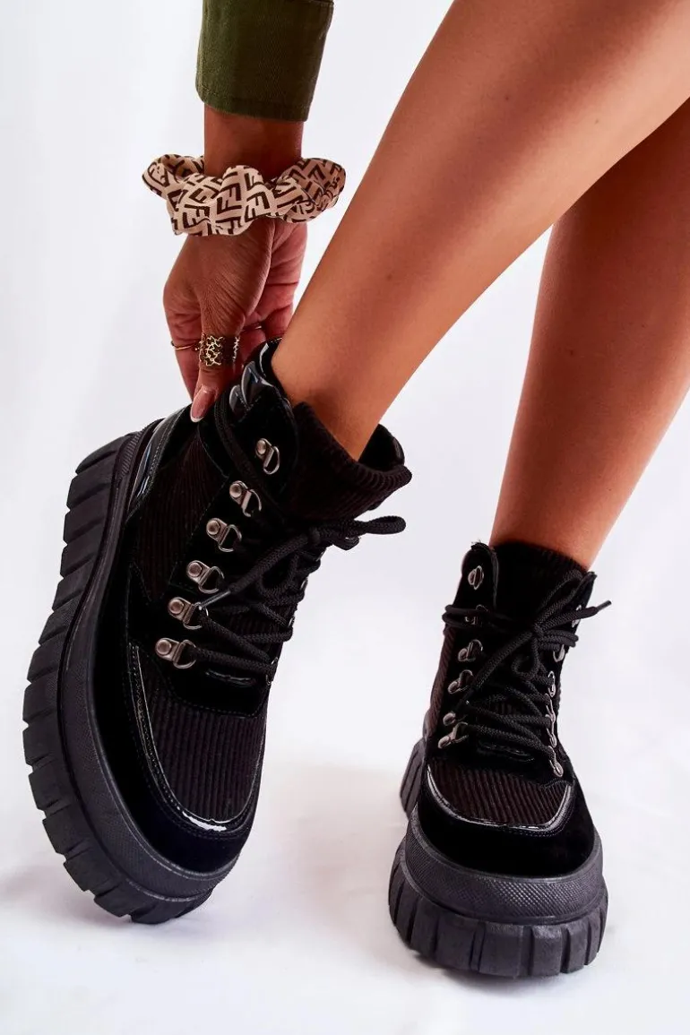 Modne botki damskie zostały wykonane z wierzchu z materiału tekstylnego. Posiadają wstawki z eko skóry. Model wiązany na okrągłe sznurowadła. Środek jest ocieplony kocem obuwniczym. Botki osadzone na platformie ze żłobieniami. Podeszwa antypoślizgowa. Nosek zaokrąglony. Powinnaś mieć ten model w swojej szafie! Nie czekaj dłużej – kup już dziś! Przy wyborze rozmiaru prosimy sugerować się tabelą rozmiarów.