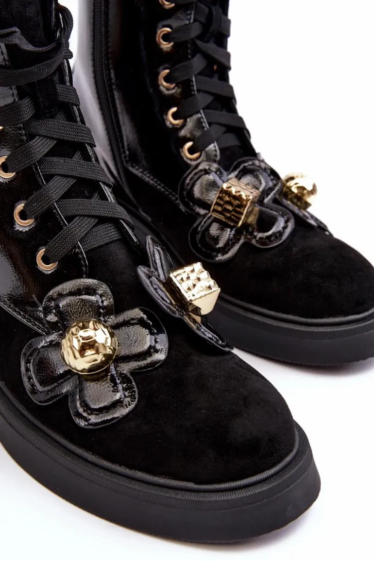 Damskie botki zostały wykonane z wysokiej jakości eko skóry. Osadzono je na płaskim obcasie i platformie. Z przodu posiadają sznurowanie, natomiast z boku cholewki znajduje się suwak ułatwiający zakładanie obuwia. Środek ocieplono miłym w dotyku kocem obuwniczym. Dodatkowo model ten ozdobiono kwiatami z materiału i tworzywa sztucznego. Ten model na pewno wykorzystasz w wielu stylizacjach! Przy wyborze rozmiaru prosimy sugerować się tabelą rozmiarów.