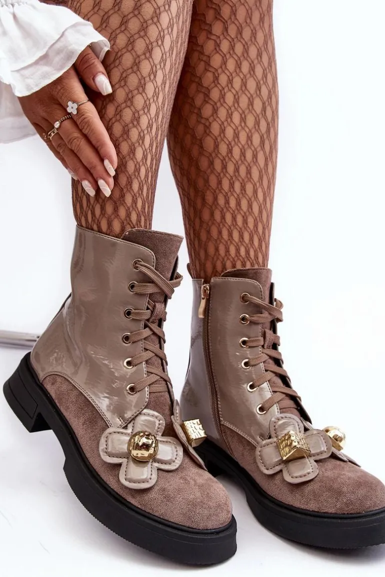 Damskie botki zostały wykonane z wysokiej jakości eko skóry. Osadzono je na płaskim obcasie i platformie. Z przodu posiadają sznurowanie, natomiast z boku cholewki znajduje się suwak ułatwiający zakładanie obuwia. Środek ocieplono miłym w dotyku kocem obuwniczym. Dodatkowo model ten ozdobiono kwiatami z materiału i tworzywa sztucznego. Ten model na pewno wykorzystasz w wielu stylizacjach! Przy wyborze rozmiaru prosimy sugerować się tabelą rozmiarów.