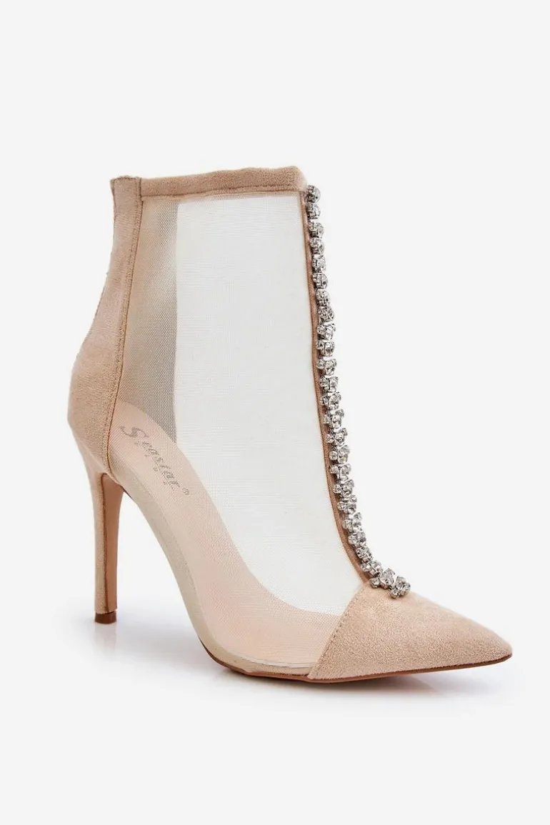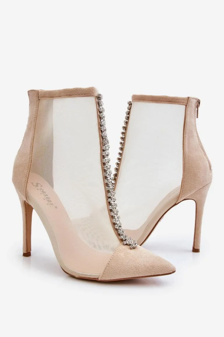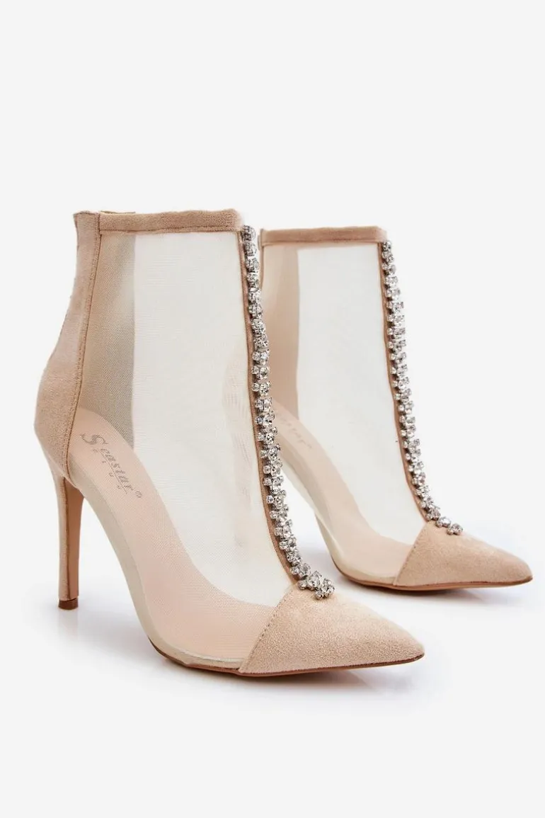Botki z siateczką. Piękne botki zostały wykonane z połączenia eko zamszu oraz siateczkowego materiału. Model osadzony na obcasie w postaci szpilki, z noskiem w szpic optycznie wysmukli nogi. Cholewka została ozdobiona na przodzie mieniącymi się dżetami imitującymi cyrkonie. Botki są zapinane z tyłu na suwak. Zapiętek w tych botkach jest usztywniany. Model ten idealnie będzie prezentować się z eleganckimi stylizacjami! Przy wyborze rozmiaru prosimy sugerować się tabelą rozmiarów. Botki z siateczką!