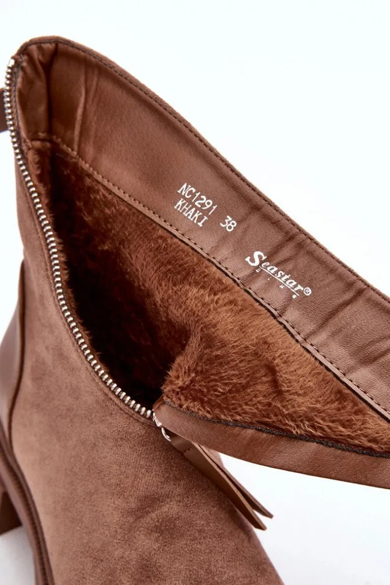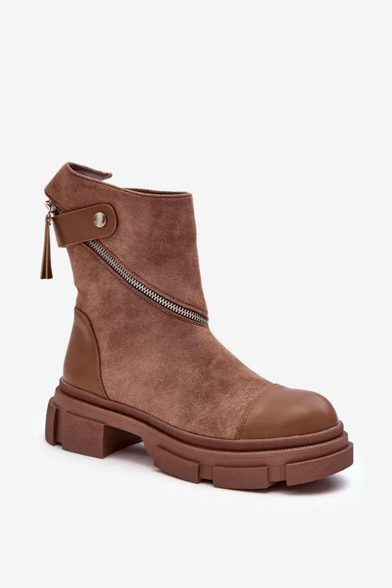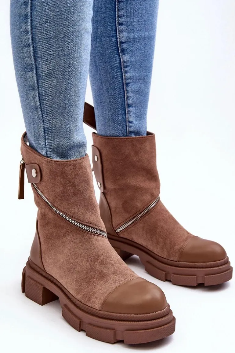 Wyjątkowe botki damskie zapinane na zamek błyskawiczny oraz napę. Wyjątkowy fason zachwyci niejedną miłośniczkę modowych nowości! Botki zostały wykonane z połączenia eko skóry oraz eko zamszu. Środek ocieplony przyjemnym w dotyku futerkiem. Osadzone na platformie i obcasie w postaci słupka. Nieregularne zakończenie cholewki dodaje charakteru tym butom! Przy wyborze rozmiaru prosimy sugerować się tabelą rozmiarów.