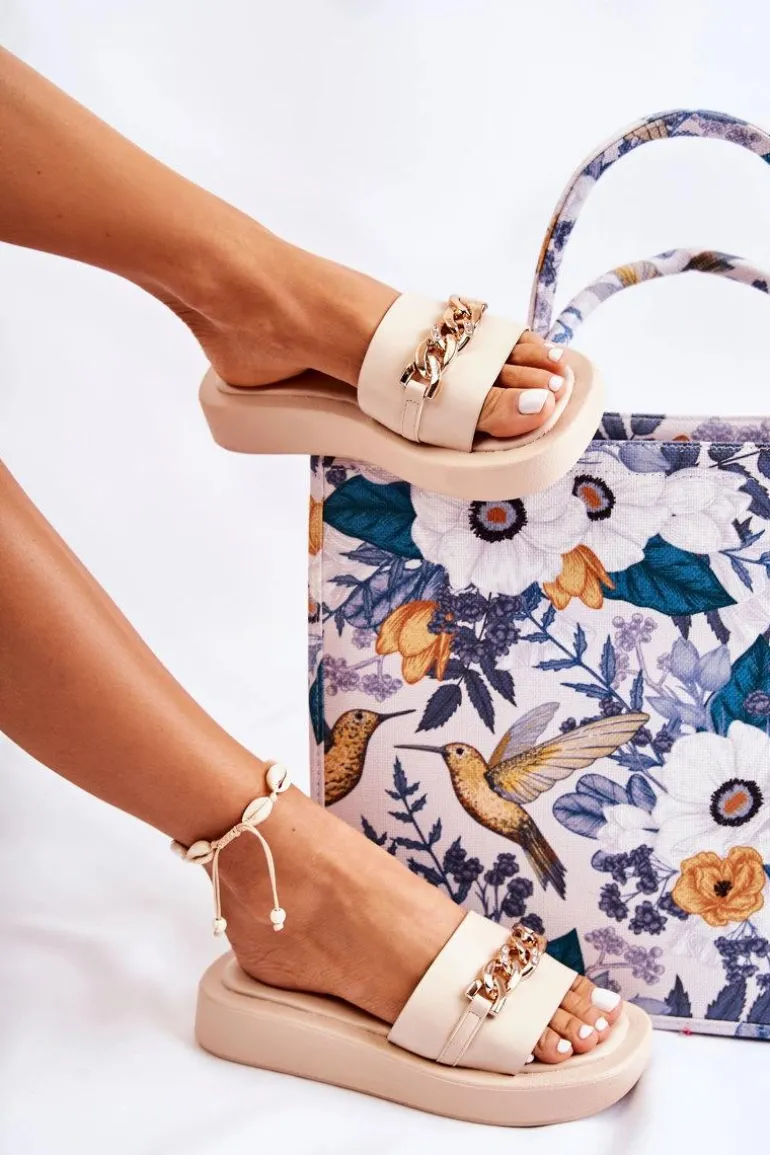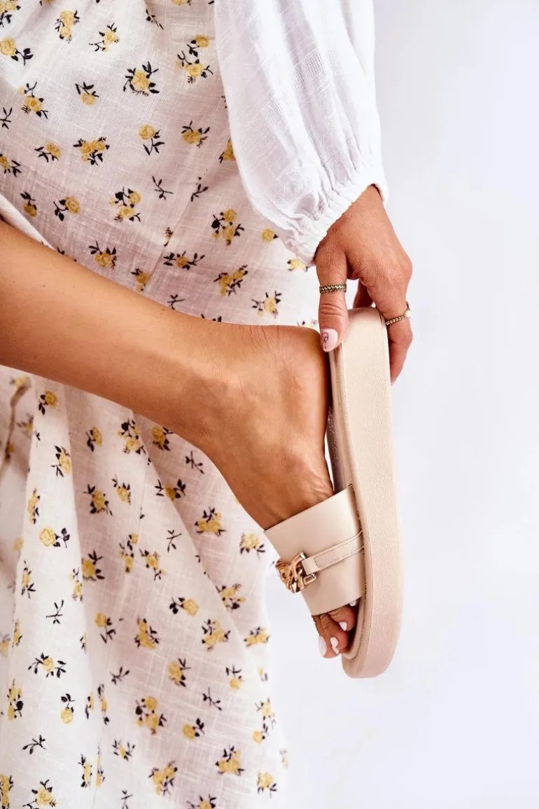 Eleganckie klapki damskie z modnym łańcuchem na przodzie. Ozdoba wykonana z tworzywa sztucznego. Miękka wkładka Comfort Shoes wykonana z eko skóry, która jest bardzo wygodna w użytkowaniu. Nosek odkryty, zaokrąglony. Osadzone na płaskim obcasie, z podeszwą wykonaną z tworzywa sztucznego. Solidny model, idealny na letnie dni! Przy wyborze rozmiaru prosimy sugerować się tabelą rozmiarów.