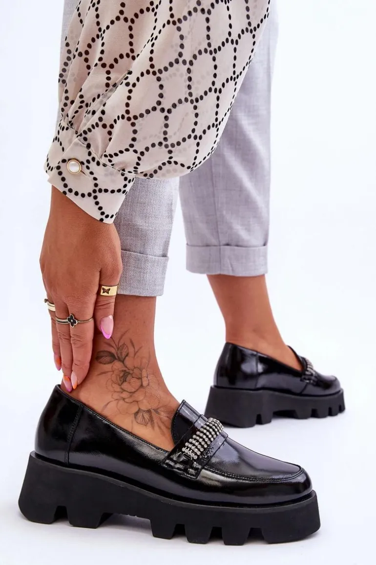 Modne, damskie mokasyny zostały osadzone na płaskim obcasie i platformie ze żłobieniami. Ozdobione z przodu łańcuszkiem z dżetami. Cholewka wraz z wkładką zostały wykonane z naturalnej skóry. Wkładka jest niezwykle miękka i zapewni wygodę podczas użytkowania. Zapiętek w tych mokasynach jest usztywniany. Idealny model na sezon wiosenno-jesienny! Przy wyborze rozmiaru prosimy sugerować się tabelą rozmiarów.
