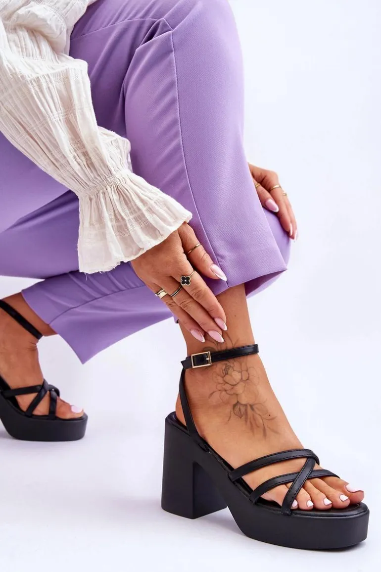 Wyjątkowe, damskie sandały zostały wykonane z eko skóry. Model ten posiada zapinanie wokół kostki na regulowany pasek ze sprzączką i jest niezwykle lekki. Sandałki osadzono na platformie oraz masywnym, szerokim słupku. Wygodna wkładka została wykonana także z eko skóry. Przy wyborze rozmiaru prosimy sugerować się tabelą rozmiarów.