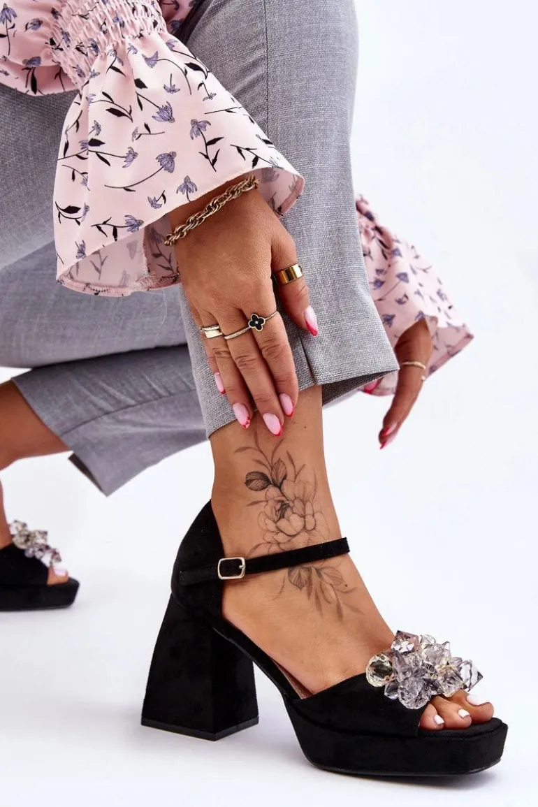Eleganckie i modne sandałki zostały osadzone na masywnym obcasie w postaci słupka. Paseczek na przodzie został ozdobiony kryształkami. Miękka wkładka z eko skóry zadba o Twój komfort podczas użytkowania. Model ten świetnie sprawdzi się na różnego rodzaju ważnych uroczystościach. Ten fason to HIT, dlatego powinnaś mieć je w swojej szafie! Przy wyborze rozmiaru prosimy sugerować się tabelą rozmiarów.
