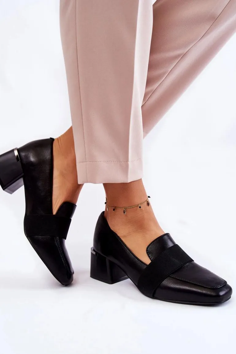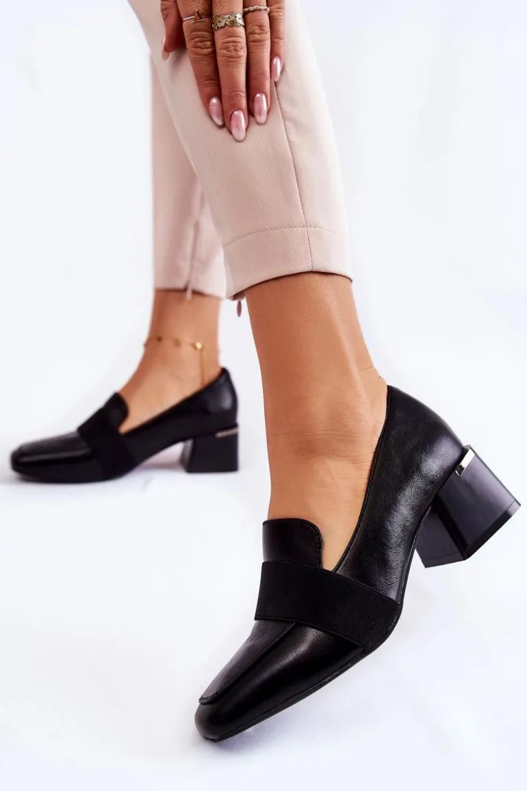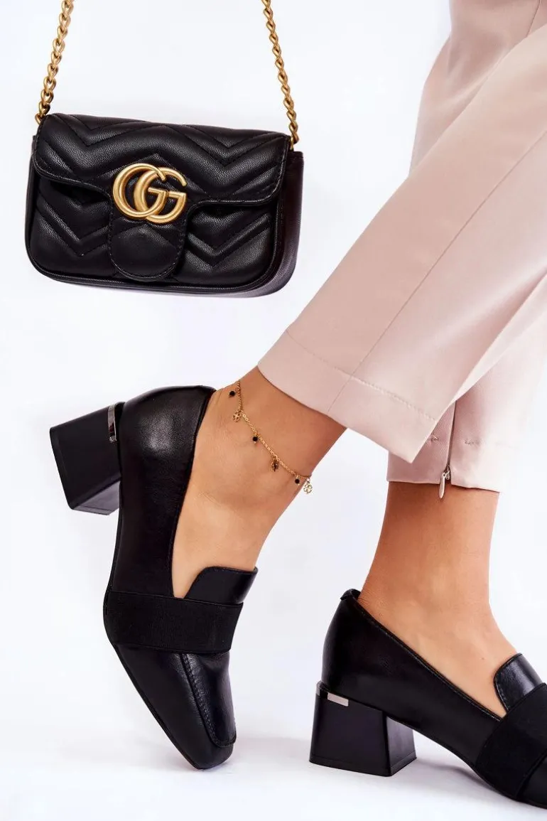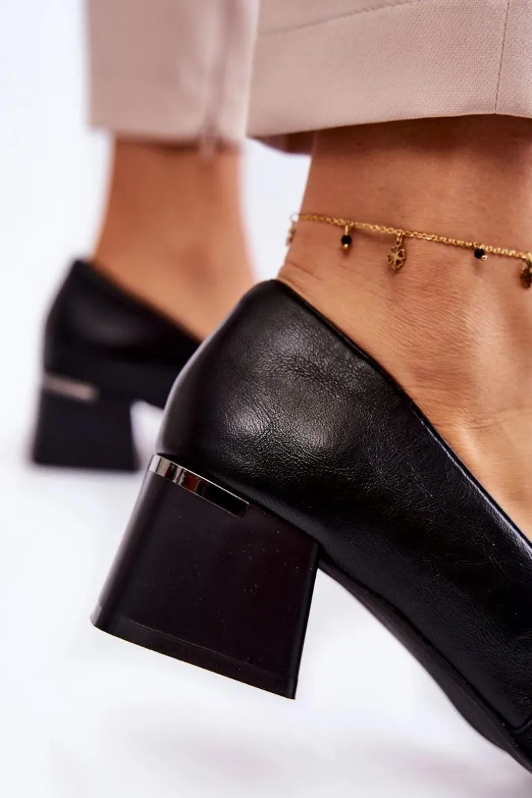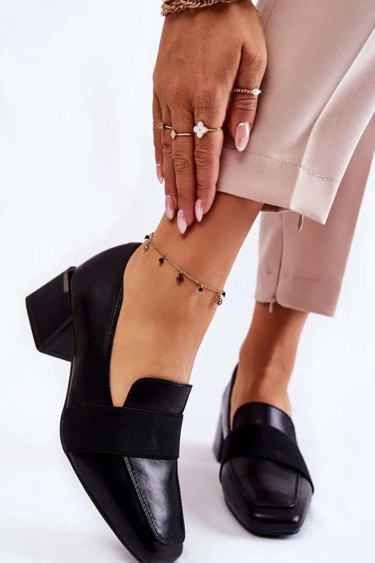 Modne czółenka zostały wykonane z wysokiej jakości eko skórzanych materiałów. Posiadają ozdobną gumę na wysokości śródstopia. Dodatkowo usztywniany zapiętek zapewni odpowiednią stabilizację stopy. Czółenka te posiadają miękką wkładkę wykonaną z naturalnej skóry. Wygoda i komfort zapewnione! Buty te zostały osadzone na obcasie w postaci niskiego klocka. Przy wyborze rozmiaru prosimy sugerować się tabelą rozmiarów.