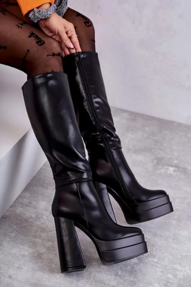 Modne kozaki damskie zostały osadzone na masywnym obcasie w postaci wysokiego słupka oraz platformy. Dodatkowo posiadają usztywniany zapiętek. Zamykane na całej długości cholewki na suwak. Kozaki zostały wykonane z eko skóry. Świetny fason, który wyróżni Cię z tłumu. Koniecznie powinnaś je mieć w swojej garderobie! Przy wyborze rozmiaru prosimy sugerować się tabelą rozmiarów.
