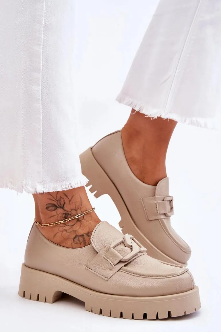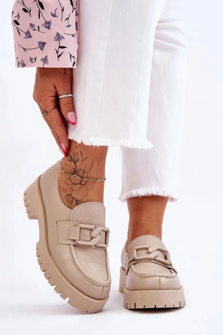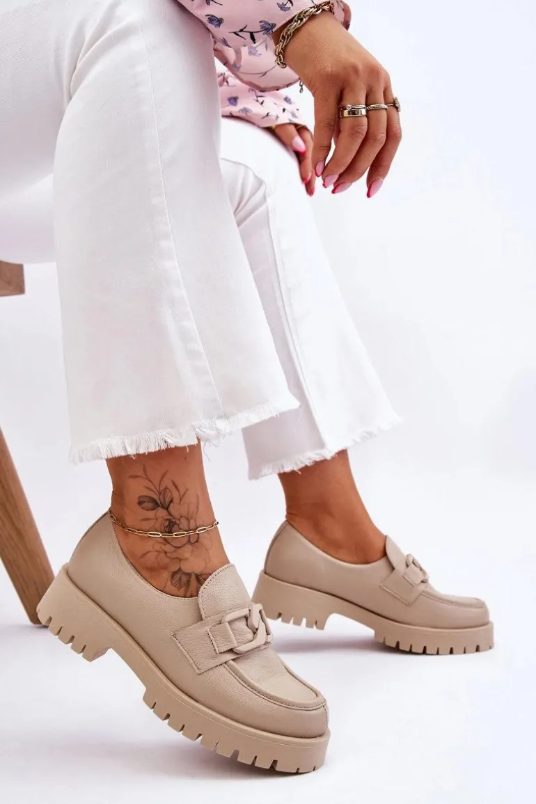 Półbuty wsuwane wykonane z naturalnej skóry z zaokrąglonym noskiem. Osadzone na masywnej platformie i płaskim, stabilnym obcasie. Model z wysokim bieżnikiem na podeszwie. Na górze dekoracyjny łańcuch. Pod językiem znajduje się elastyczna gumka ściągająca, dzięki której but będzie bardziej dopasowany do stopy. Półbuty posiadają usztywniany zapiętek. Modne, wygodne, wykonane z dbałością o szczegóły – jednym słowem: idealne! Miękka, wykonana z naturalnej skóry wkładka zadba o Twój komfort. Przy wyborze rozmiaru prosimy sugerować się tabelą rozmiarów.