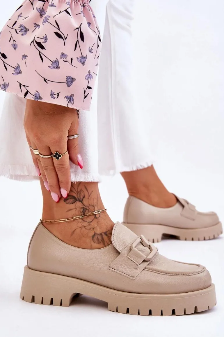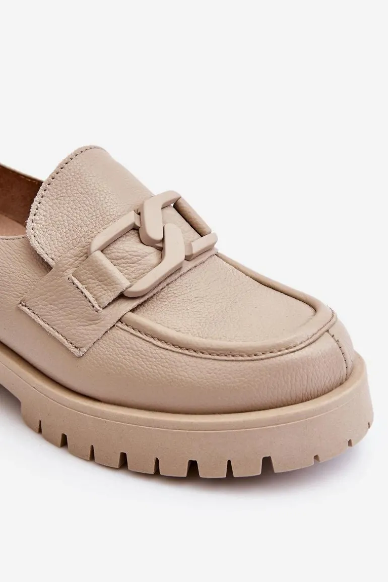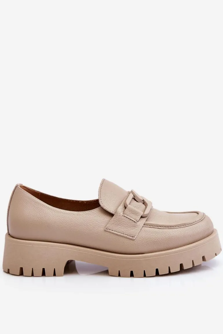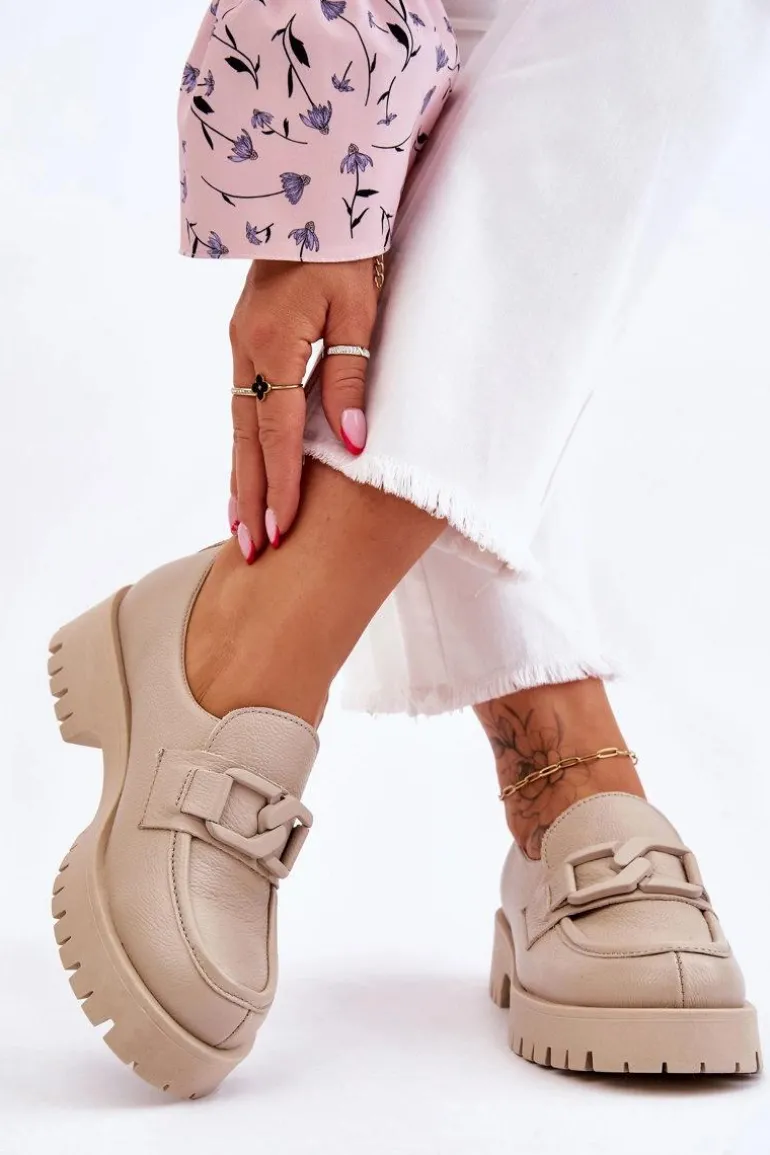 Półbuty wsuwane wykonane z naturalnej skóry z zaokrąglonym noskiem. Osadzone na masywnej platformie i płaskim, stabilnym obcasie. Model z wysokim bieżnikiem na podeszwie. Na górze dekoracyjny łańcuch. Pod językiem znajduje się elastyczna gumka ściągająca, dzięki której but będzie bardziej dopasowany do stopy. Półbuty posiadają usztywniany zapiętek. Modne, wygodne, wykonane z dbałością o szczegóły – jednym słowem: idealne! Miękka, wykonana z naturalnej skóry wkładka zadba o Twój komfort. Przy wyborze rozmiaru prosimy sugerować się tabelą rozmiarów.