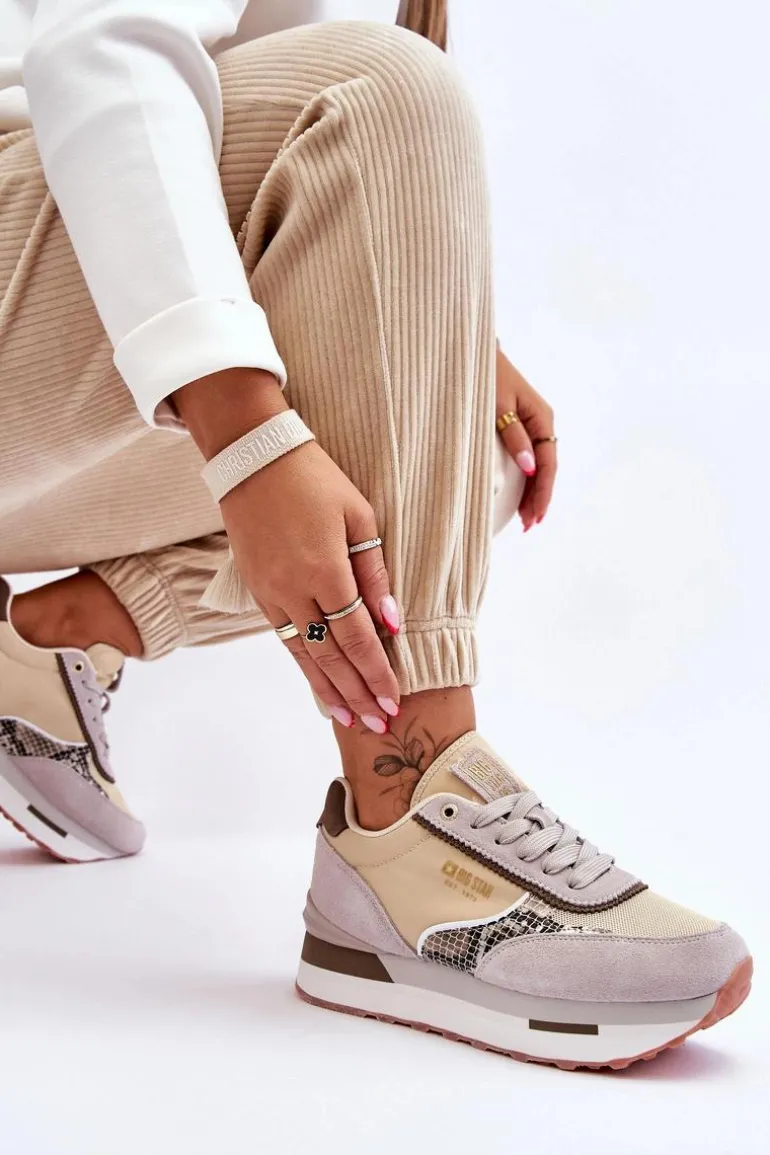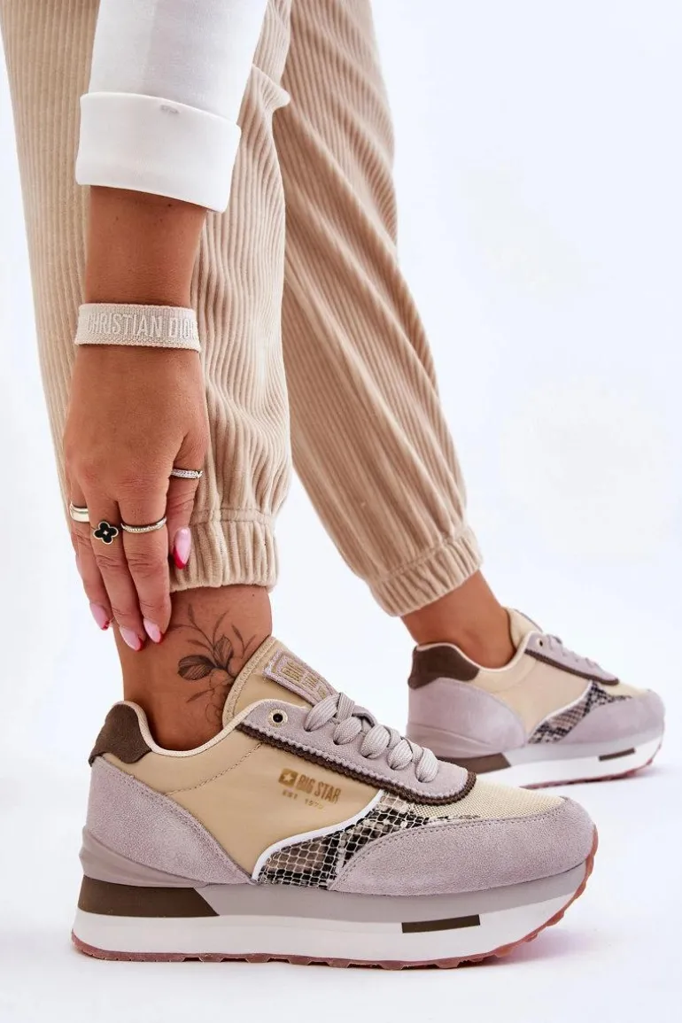 Modne sneakersy damskie od marki Big Star zostały wykonane z połączenia materiału tekstylnego oraz naturalnego zamszu. Model ten posiada klasyczne sznurowanie. Wkładka Memory Foam System zapamiętuje kształt stopy, zapewnia doskonałe dopasowanie, absorbuje wstrząsy, jest odporna na odkształcenia oraz pozwala na odparowanie wilgoci i regulację temperatury. Buty zostały osadzone na masywnej platformie z antypoślizgową podeszwą. Dodatkowo posiadają usztywniany zapiętek. Przy wyborze rozmiaru prosimy sugerować się tabelą rozmiarów.