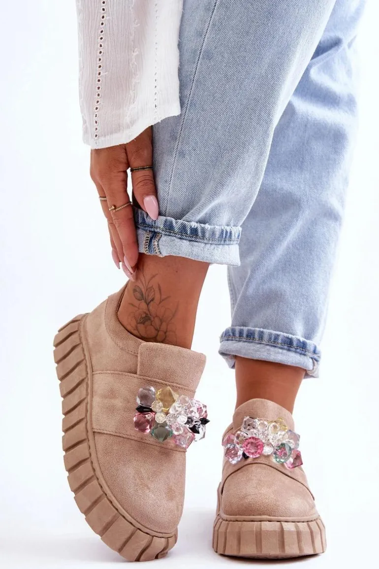 Te wyjątkowe buty sportowe na pewno skradną Twoje serce! Zostały wykonane z miękkiego eko zamszu. Model jest wsuwany i dodatkowo posiada na przodzie zdobienie w postaci kryształków. Buty zostały osadzone na masywnej platformie z antypoślizgową podeszwą. Miękka wkładka z połączenia pianki oraz materiału tekstylnego zapewni komfortowe użytkowanie obuwia. Przy wyborze rozmiaru prosimy sugerować się tabelą rozmiarów.